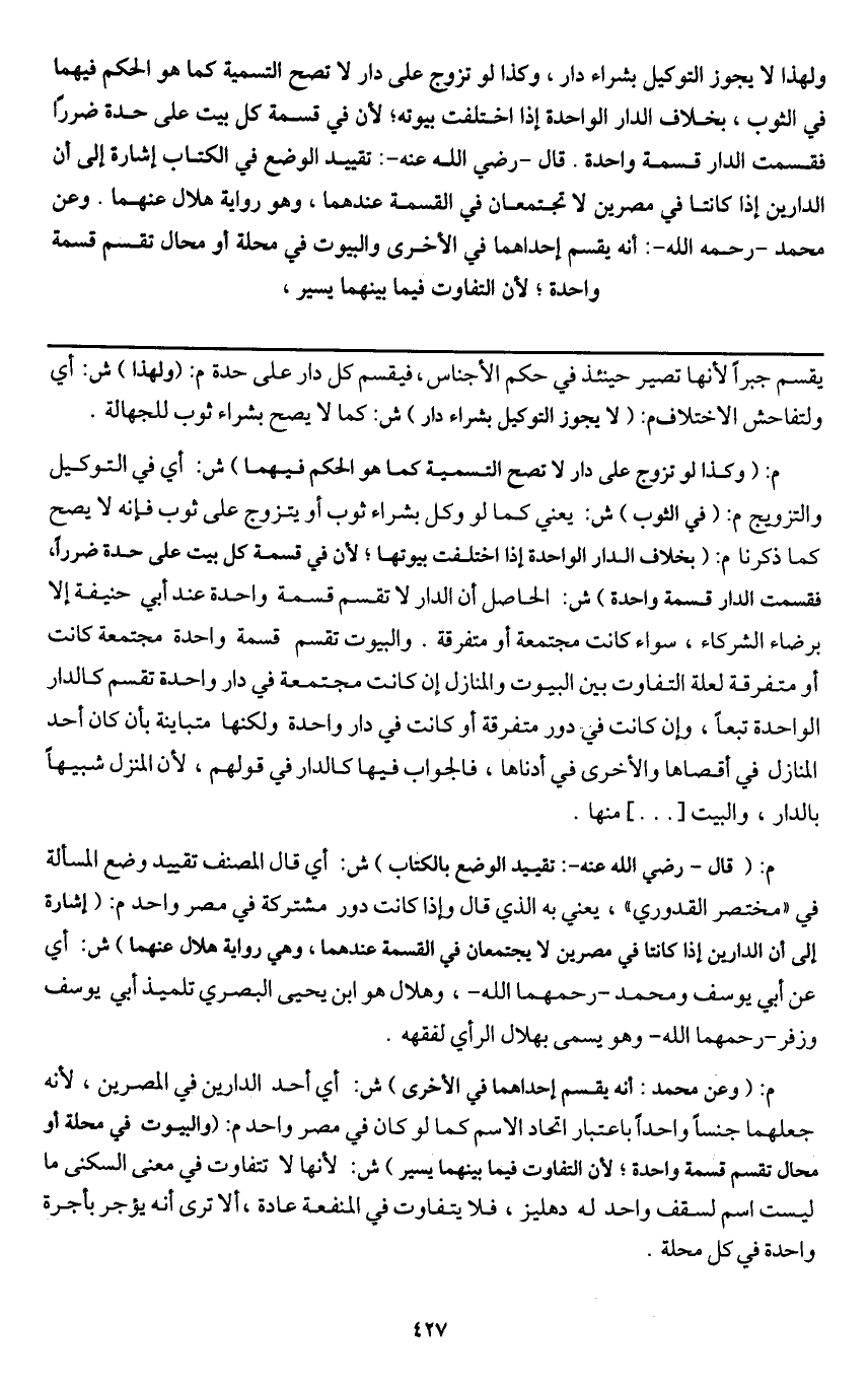 م: (قال - رَضِيَ اللَّهُ عَنْهُ -: تقييد الوضع بالكتاب) ش: أي قال المصنف تقييد وضع المسألة في " مختصر القدوري "، يعني به الذي قال وإذا كانت دور مشتركة في مصر واحد م: (إشارة إلى أن الدارين كانتا في مصرين لا يجتمعان في القسمة عندهما، وهي رواية هلال عنهما) ش: أي عن أبي يوسف ومحمد - رحمهما الله -، وهلال هو ابن يحيى البصري تلميذ أبي يوسف وزفر - رحمهما الله - وهو يسمى بهلال الرأي لفقهه.