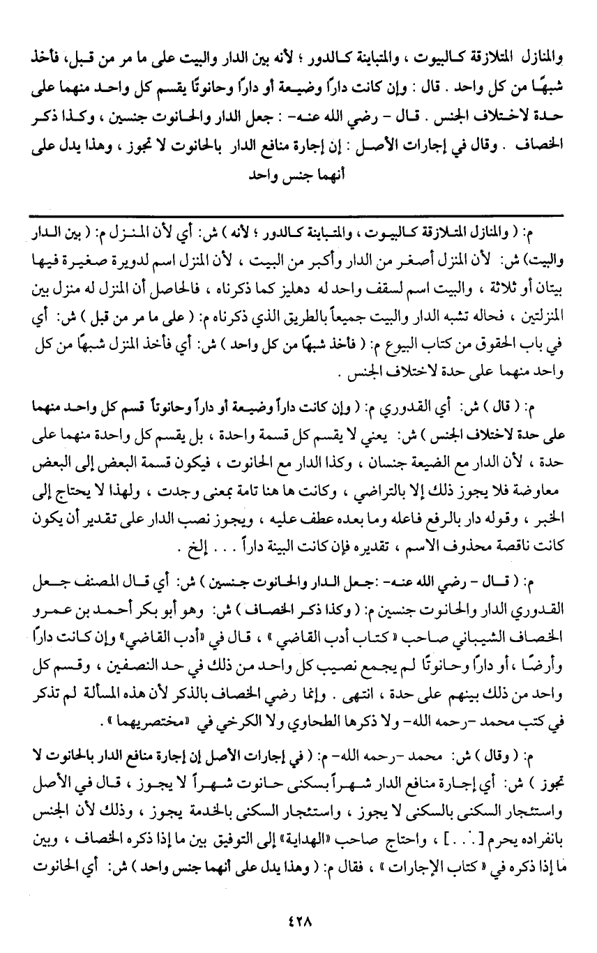 قال: وإن كانت دارا وضيعة أو دارا وحانوتا يقسم كل واحد منهما على حدة لاختلاف الجنس. قال - رَضِيَ اللَّهُ عَنْهُ -: جعل الدار والحانوت جنسين، وكذا ذكر الخصاف.