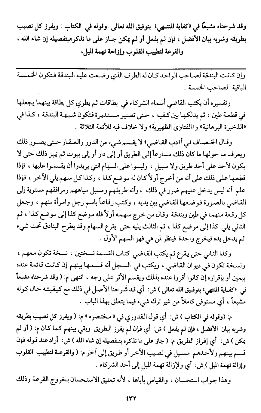 وكذا الثاني حتى يقرع ثم يكتب القاضي كتاب القسمة نسختين، نسخة تكون معهم، ونسخة تكون في ديوان القاضي، ويكتب في السجل أنه قسمها بينهم إن كانت قائمة عنده بيمين أو بإقراره إن كانوا أقروا عنده بذلك ويقسم الأثر على وجه، انتهى م: (وقد شرحناه مشبعا في " كفاية المنتهي " بتوفيق الله تعالى) ش: أي قد شرحنا الأصل في ذلك مع كيفيته حال كونه مشبعا، أي مستوفى كاملا من غير ترك شيء فيما يتعلق بهذا الباب.