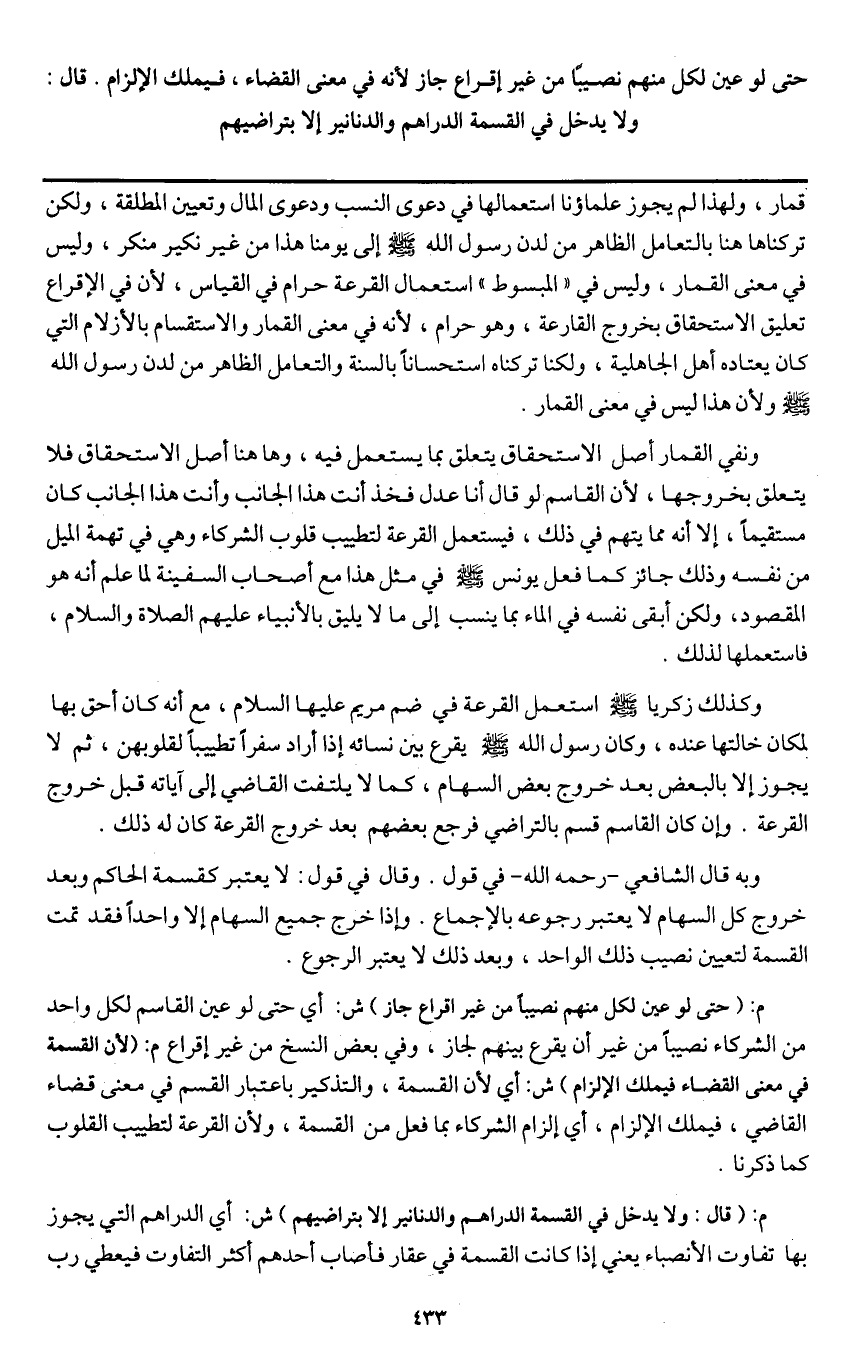 ـــــــــــــــــــــــــــــQقمار، ولهذا لم يجوز علماؤنا استعمالها في دعوى النسب ودعوى المال وتعيين المطلقة، ولكن تركناها هنا بالتعامل الظاهر من لدن رسول الله - صَلَّى اللَّهُ عَلَيْهِ وَسَلَّمَ - إلى يومنا هذا من غير نكير منكر، وليس في معنى القمار، وليس في " المبسوط " استعمال القرعة حرام في القياس، لأن في الإقراع تعليق الاستحقاق بخروج القارعة، وهو حرام، لأنه في معنى القمار والاستقسام بالأزلام التي كان يعتاده أهل الجاهلية، ولكنا تركناه استحسانا بالسنة والتعامل الظاهر من لدن رسول الله - صَلَّى اللَّهُ عَلَيْهِ وَسَلَّمَ - ولأن هذا ليس في معنى القمار.