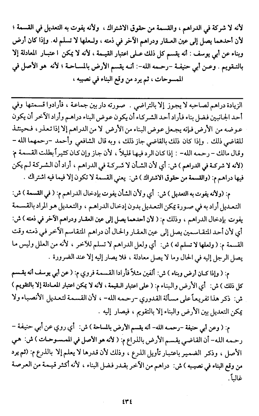 لأنه لا شركة في الدراهم، والقسمة من حقوق الاشتراك، ولأنه يفوت به التعديل في القسمة؛ لأن أحدهما يصل إلى عين العقار ودراهم الآخر في ذمته، ولعلها لا تسلم له. وإذا كان أرض وبناء عن أبي يوسف: أنه يقسم كل ذلك على اعتبار القيمة، لأنه لا يمكن اعتبار المعادلة إلا بالتقويم. وعن أبي حنيفة - رَحِمَهُ اللَّهُ -: أنه يقسم الأرض بالمساحة؛ لأنه هو الأصل في الممسوحات، ثم يرد من وقع البناء في نصيبه