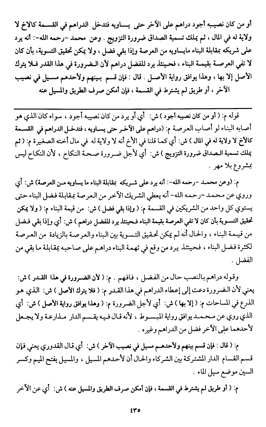 أو من كان نصيبه أجود دراهم على الآخر حتى يساويه فتدخل الدراهم في القسمة كالأخ لا ولاية له في المال، ثم يملك تسمية الصداق ضرورة التزويج. وعن محمد - رَحِمَهُ اللَّهُ -: أنه يرد على شريكه بمقابلة البناء ما يساويه من العرصة وإذا بقي فضل، ولا يمكن تحقيق التسوية، بأن كان لا تفي العرصة بقيمة البناء، فحينئذ يرد للفضل دراهم لأن الضرورة في هذا القدر فلا يترك الأصل إلا بها، وهذا يوافق رواية الأصل.