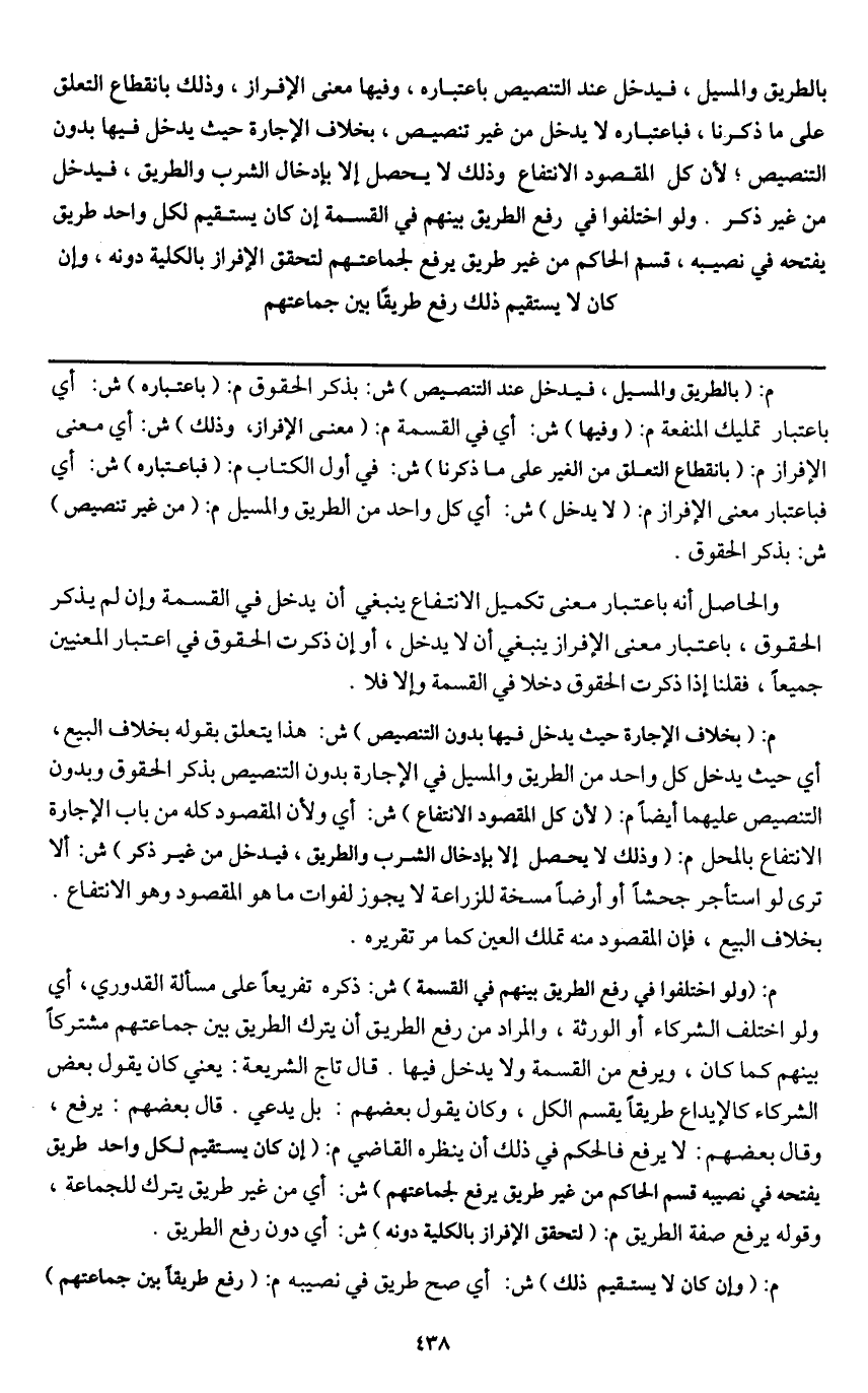 ـــــــــــــــــــــــــــــQم: (بالطريق والمسيل، فيدخل عند التنصيص) ش: بذكر الحقوق م: (باعتباره) ش: أي باعتبار تمليك المنفعة م: (وفيها) ش: أي في القسمة م: (معنى الإفراز، وذلك) ش: أي معنى الإفراز م: (بانقطاع التعلق من الغير على ما ذكرنا) ش: في أول الكتاب م: (فباعتباره) ش: أي فباعتبار معنى الإفراز (لا يدخل) ش: أي كل واحد من الطريق والمسيل م: (من غير تنصيص) ش: بذكر الحقوق.