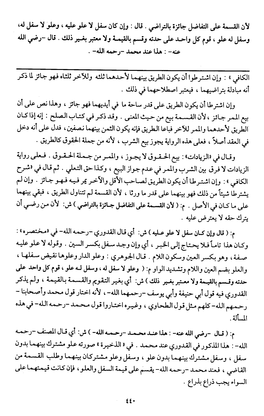 ـــــــــــــــــــــــــــــQالكافي ": وإن اشترطوا أن يكون الطريق بينهما لأحدهما ثلثه وللآخر ثلثاه فهو جائز لما ذكر أنه مبادلة بتراضيهما، فيعتبر اصطلاحهما في ذلك.