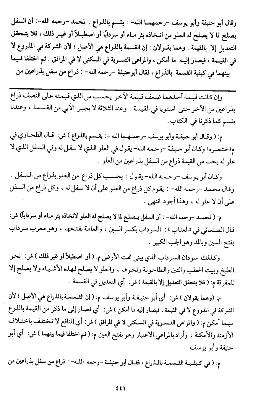 م: (في كيفية القسمة بالذراع، فقال أبو حنيفة - رَحِمَهُ اللَّهُ -: ذراع من سفل بذراعين من