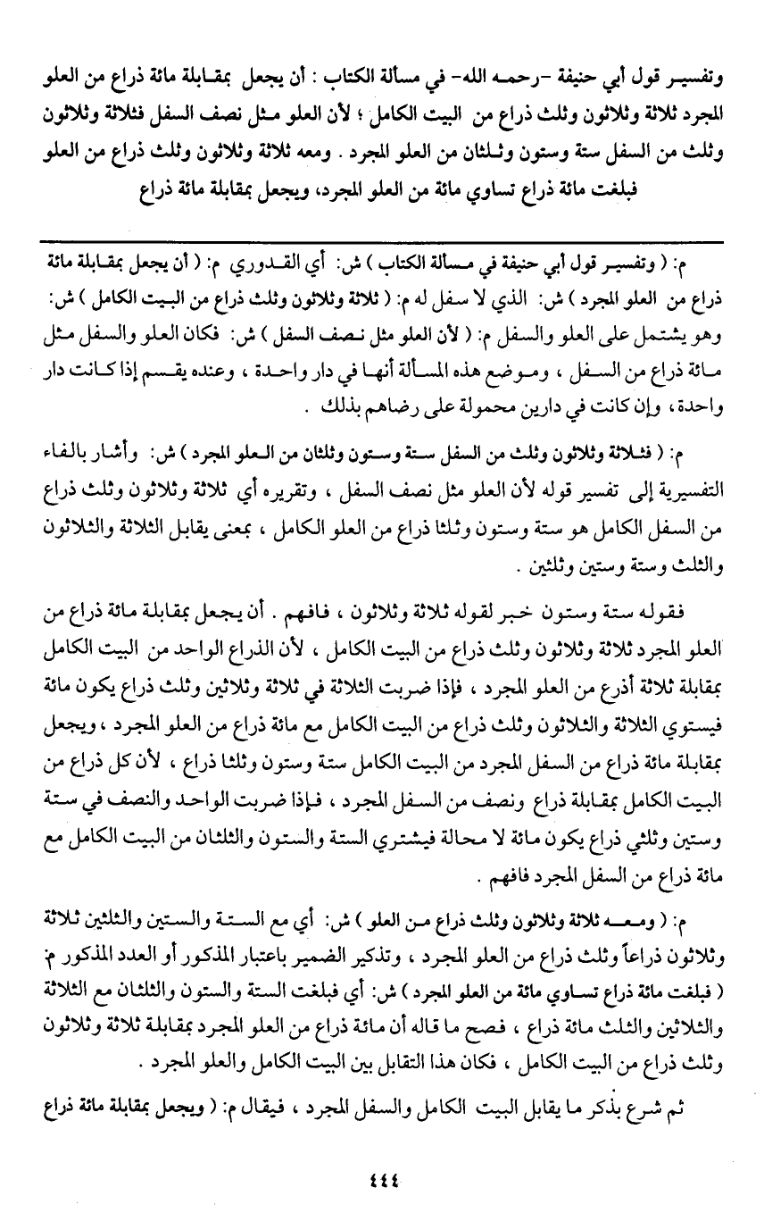 فقوله: ستة وستون خبر لقوله ثلاثة وثلاثون، فافهم. أن يجعل بمقابلة مائة ذراع من العلو المجرد ثلاثة وثلاثون وثلث ذراع من البيت الكامل، لأن الذراع الواحد من البيت الكامل بمقابلة ثلاثة أذرع من العلو المجرد، فإذا ضربت الثلاثة في ثلاثة وثلاثين وثلث ذراع يكون مائة فيستوي الثلاثة والثلاثون وثلث ذراع من البيت الكامل مع مائة ذراع من العلو المجرد، ويجعل بمقابلة مائة ذراع من السفل المجرد من البيت الكامل ستة وستون وثلثا ذراع، لأن كل ذراع من البيت الكامل بمقابلة ذراع ونصف من السفل المجرد، فإذا ضربت الواحد والنصف في ستة وستين وثلثي ذراع يكون مائة لا محالة فيشتري الستة والستون والثلثان من البيت الكامل مع مائة ذراع من السفل المجرد فافهم.