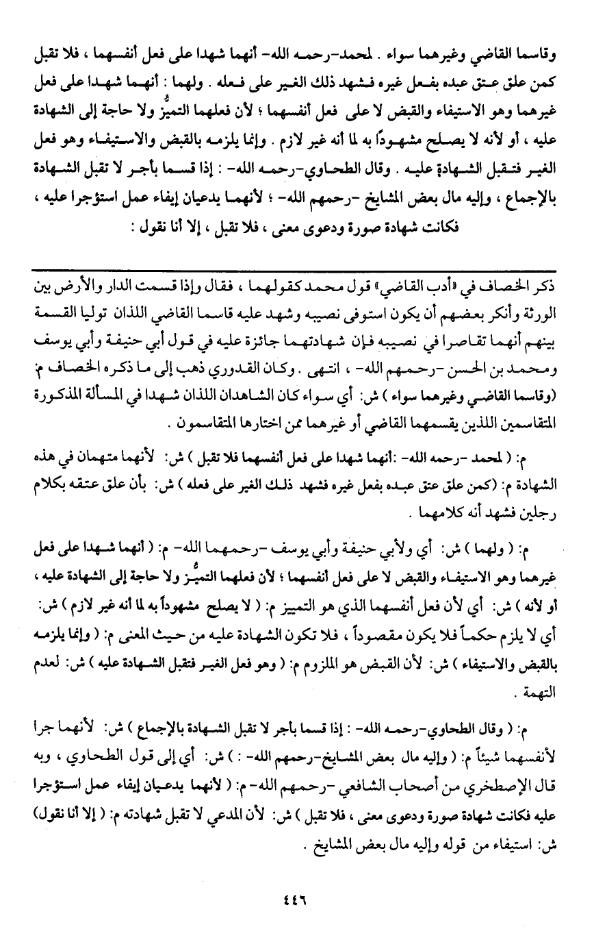 ـــــــــــــــــــــــــــــQذكر الخصاف في " أدب القاضي " قول محمد كقولهما، فقال: وإذا قسمت الدار والأرض بين الورثة وأنكر بعضهم أن يكون استوفى نصيبه وشهد عليه قاسِما القاضي اللذان توليا القسمة بينهم أنهما تقاصرا في نصيبه فإن شهادتهما جائزة عليه في قول أبي حنيفة وأبي يوسف ومحمد بن الحسن - رَحِمَهُمُ اللَّهُ -، انتهى. وكان القدوري ذهب إلى ما ذكره الخصاف م: (وقاسما القاضي وغيرهما سواء) ش: أي سواء كان الشاهدان اللذان شهدا في المسألة المذكورة المتقاسمين اللذين يقسمهما القاضي أو غيرهما ممن اختارها المتقاسمون.