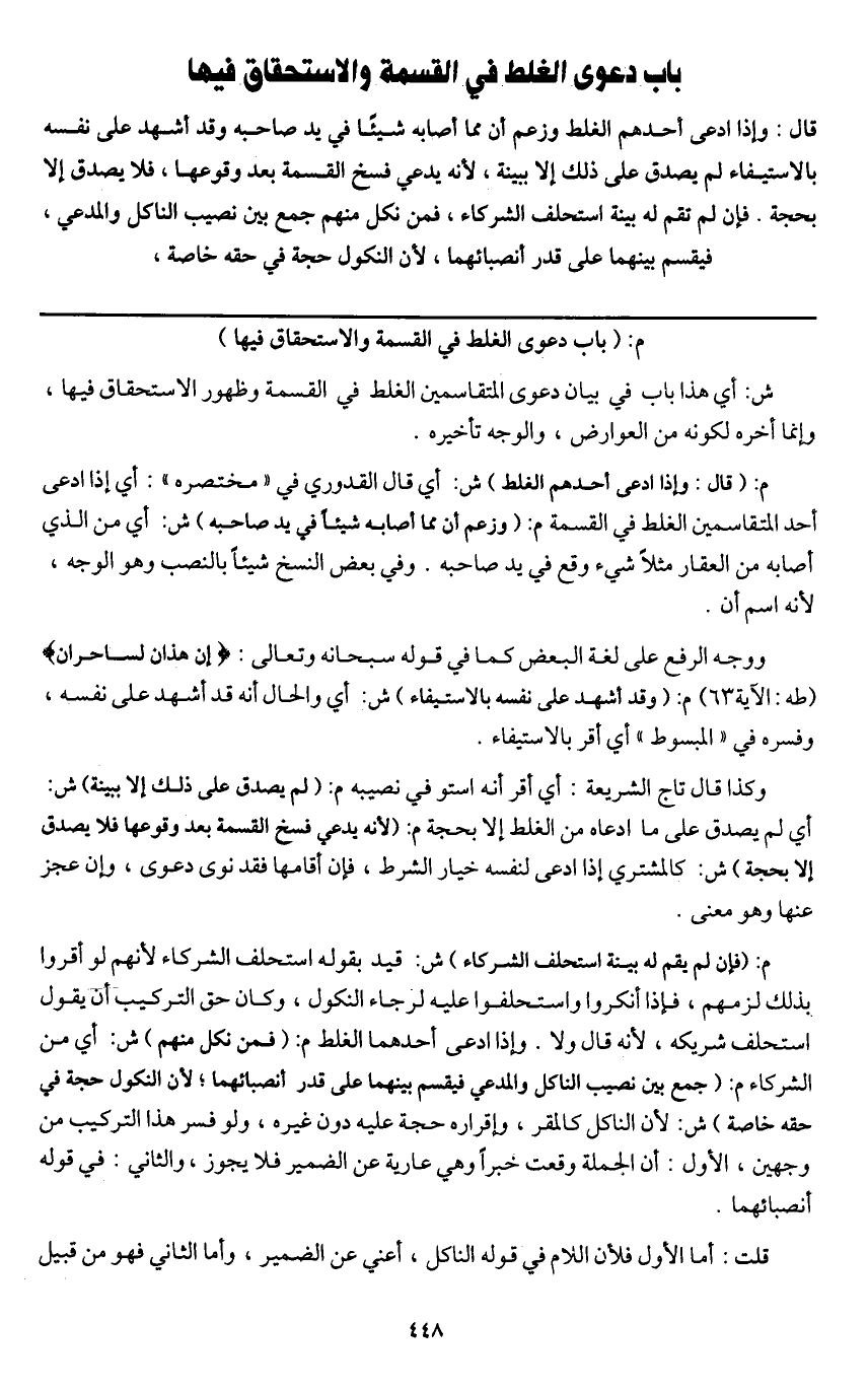 باب دعوى الغلط في القسمة والاستحقاق فيها قال: وإذا ادعى أحدهم الغلط وزعم أن مما أصابه شيئا في يد صاحبه وقد أشهد على نفسه بالاستيفاء لم يصدق على ذلك إلا ببينة، لأنه يدعي فسخ القسمة بعد وقوعها، فلا يصدق إلا بحجة. فإن لم تقم له بينة استحلف الشركاء، فمن نكل منهم جمع بين نصيب الناكل والمدعي، فيقسم بينهما على قدر أنصبائهما، لأن النكول حجة في حقه خاصة.