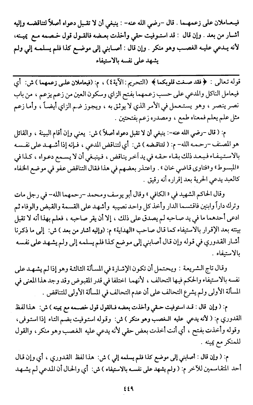 ـــــــــــــــــــــــــــــQقَوْله تَعَالَى: {فَقَدْ صَغَتْ قُلُوبُكُمَا} [التحريم: 4] (التحريم: الآية 4) ، م: (فيعاملان على زعمهما) ش: أي فيعامل الناكل والمدعي على حسب زعمهما بفتح الزاي وسكون العين من زعم يزعم، من باب نصر ينصر، وهو يستعمل في الأمر الذي لا يوثق به، ويجوز ضم الزاي أيضا، وأما زعم مثل علم يعلم فمعناه طمع، ومصدره زعم بفتحتين.