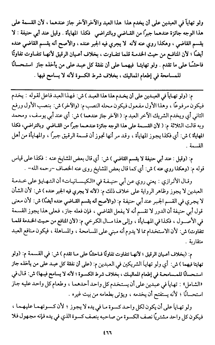 وقال الأترازي: يعني روي عن أبي حنيفة في " الكيسانيات " أن التهايؤ على خدمة العبدين لا يجوز وظاهر الرواية على خلاف ذلك م: (لأنه لا يجري فيه الجبر عنده) ش: لأن الشأن لا يجري في القسم الجبر عند أبي حنيفة م: (والأصح أنه يقسم القاضي عنده أيضا) ش: لأن معنى قول أبي حنيفة أن الدور لا تقسم أنه لا يفعل القاضي، فإن فعله جاز، فعلى هذا يجوز القسمة في الأصول، فكذا في المهايأة، وإلى هذا مال الكرخي م: (لأن المنافع من حيث الخدمة قلما تتفاوت) ش: لأن الاستخدام مما لا يدوم أنه مبني على المسامحة، والمساهلة، فيكون منافع العبد متقاربة.
