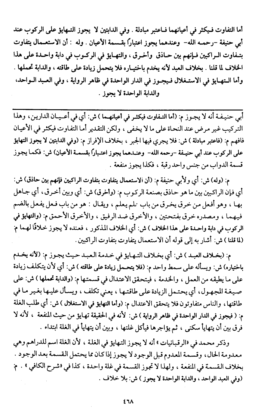 أما التفاوت فيكثر في أعيانهما فاعتبر مبادلة. وفي الدابتين لا يجوز التهايؤ على الركوب عند أبي حنيفة - رَحِمَهُ اللَّهُ - وعندهما يجوز اعتبارا بقسمة الأعيان. وله: أن الاستعمال يتفاوت بتفاوت الراكبين فإنهم بين حاذق وأخرق، والتهايؤ في الركوب في دابة واحدة على هذا الخلاف لما قلنا. بخلاف العبد لأنه يخدم باختياره فلا يتحمل زيادة على طاقته، والدابة تحملها وأما التهايؤ في الاستغلال فيجوز في الدار الواحدة في ظاهر الرواية،