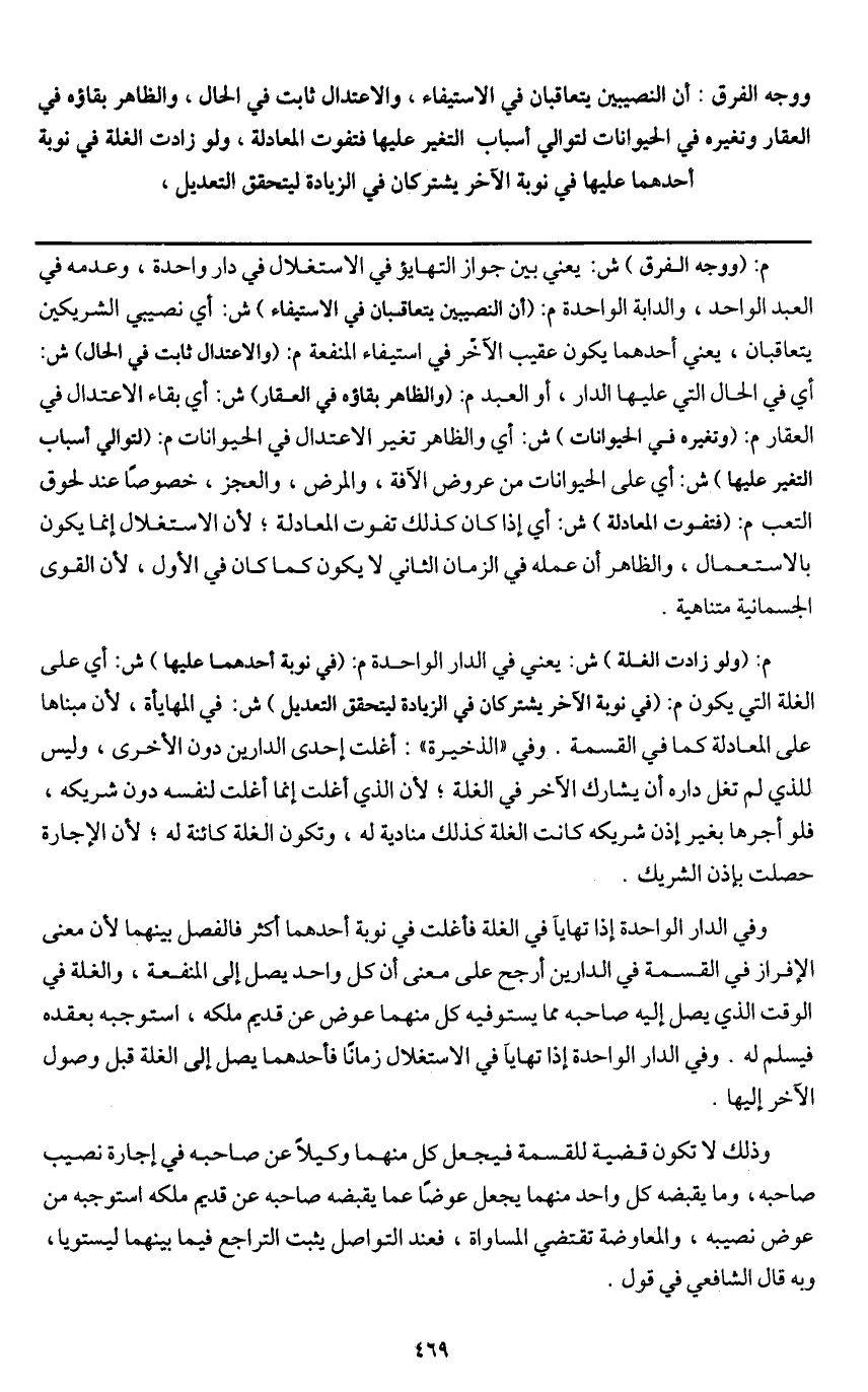 ـــــــــــــــــــــــــــــQم: (ووجه الفرق) ش: يعني بين جواز التهايؤ في الاستغلال في دار واحدة، وعدمه في العبد الواحد، والدابة الواحدة م: (أن النصيبين يتعاقبان في الاستيفاء) ش: أي نصيبي الشريكين يتعاقبان. يعني أحدهما يكون عقيب الآخر في استيفاء المنفعة م: (والاعتدال ثابت في الحال) ش: أي في الحال التي عليها الدار، أو العبد م: (والظاهر بقاؤه في العقار) ش: أي بقاء الاعتدال في العقار م: (وتغيره في الحيوانات) ش: أي والظاهر تغير الاعتدال في الحيوانات م: (لتوالي أسباب التغير عليها) ش: أي على الحيوانات من عروض الآفة، والمرض، والعجز، خصوصا عند لحوق التعب م: (فتفوت المعادلة) ش: أي إذا كان كذلك تفوت المعادلة؛ لأن الاستغلال إنما يكون بالاستعمال، والظاهر أن عمله في الزمان الثاني لا يكون كما كان في الأول، لأن القوى الجسمانية متناهية.
