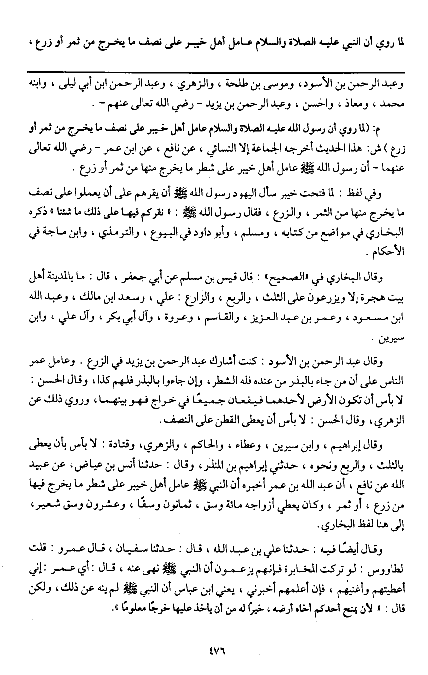 وقال البخاري في "الصحيح ": قال قيس بن مسلم عن أبي جعفر، قال: ما بالمدينة أهل بيت هجرة إلا ويزرعون على الثلث، والربع، وزارع: علي، وسعد بن مالك، وعبد الله بن مسعود، وعمر بن عبد العزيز، والقاسم، وعروة، وآل أبي بكر، وآل علي، وابن سيرين.