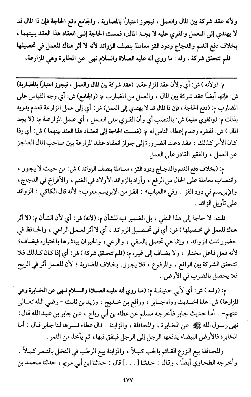 ولأنه عقد شركة بين المال والعمل، فيجوز اعتبارًا بالمضاربة، والجامع دفع الحاجة فإن ذا المال قد لا يهتدي إلى العمل والقوي عليه لا يجد المال، فمست الحاجة إلى انعقاد هذا العقد بينهما، بخلاف دفع الغنم والدجاج ودود القز معاملة بنصف الزوائد لأنه لا أثر هناك للعمل في تحصيلها فلم تتحقق شركة، وله: ما روي أنه - عَلَيْهِ الصَّلَاةُ وَالسَّلَامُ - نهى عن المخابرة وهي المزارعة