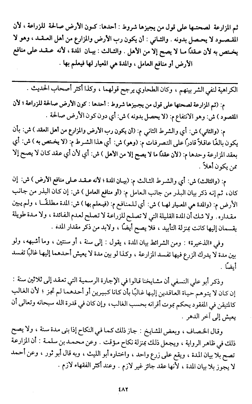 ثم المزارعة لصحتها على قول من يجيزها شروط: أحدها: كون الأرض صالحة للزراعة، لأن المقصود لا يحصل بدونه. والثاني: أن يكون رب الأرض والمزارع من أهل العقد، وهو لا يختص به لأن عقدا ما لا يصح إلا من الأهل. والثالث: بيان المدة، لأنه عقد على منافع الأرض أو منافع العامل، والمدة هي المعيار لها فيعلم بها.