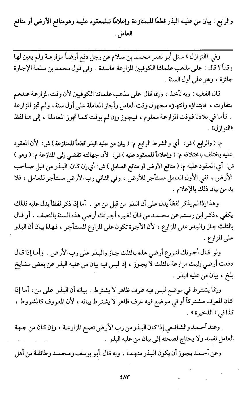 والرابع: بيان من عليه البذر قطعا للمنازعة وإعلاما للمعقود عليه وهو منافع الأرض أو منافع العامل.