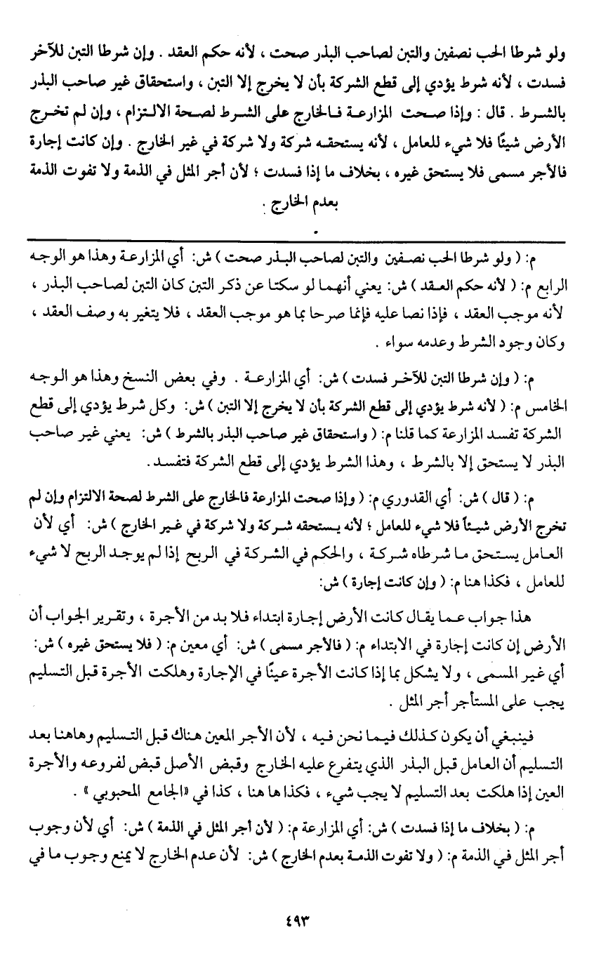 ولو شرطا الحب نصفين والتبن لصاحب البذر صحت، لأنه حكم العقد. وإن شرطا التبن للآخر فسدت، لأنه شرط يؤدي إلى قطع الشركة بأن لا يخرج إلا التبن، واستحقاق غير صاحب البذر بالشرط.