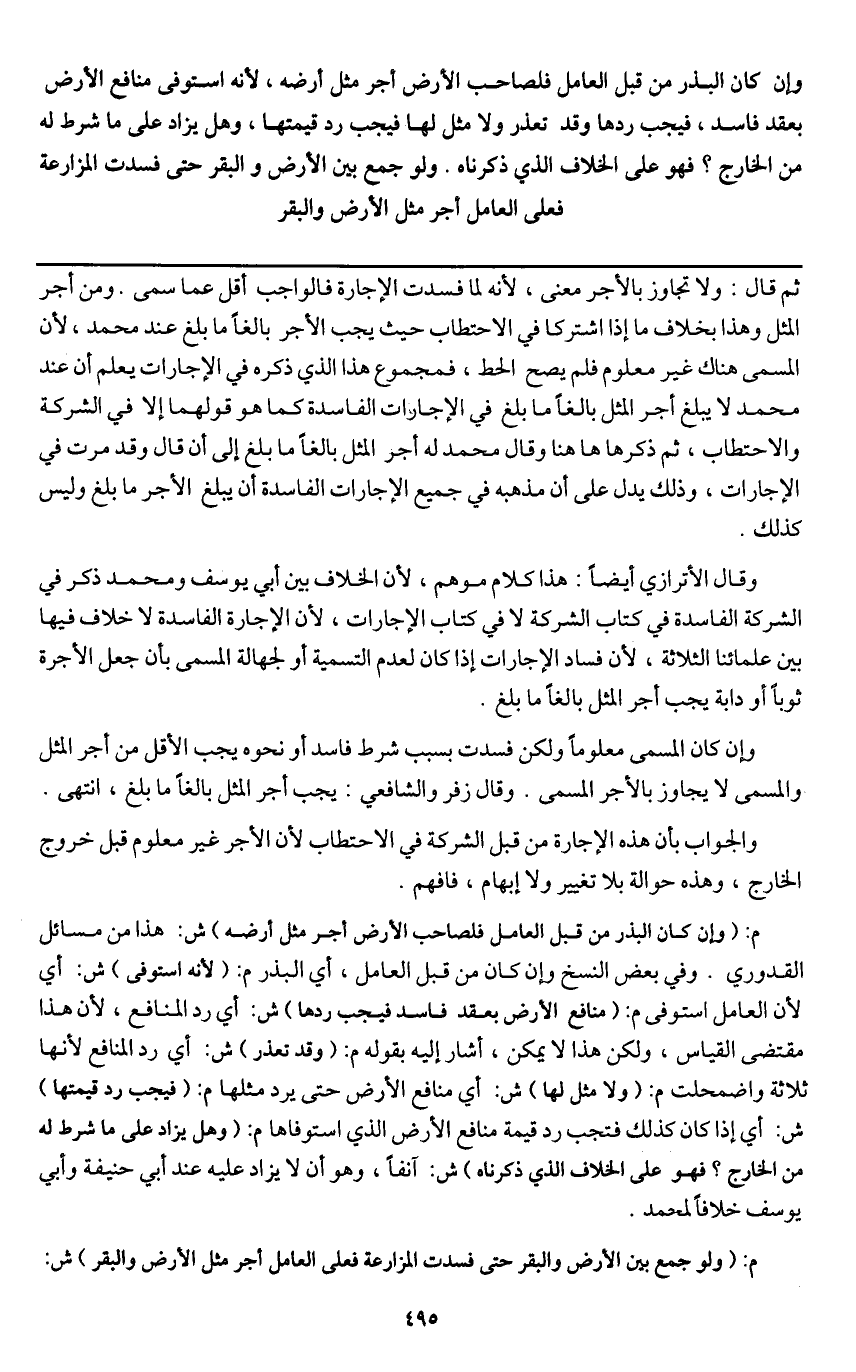 ولو جمع بين الأرض والبقر حتى فسدت المزارعة فعلى العامل أجر مثل الأرض والبقر