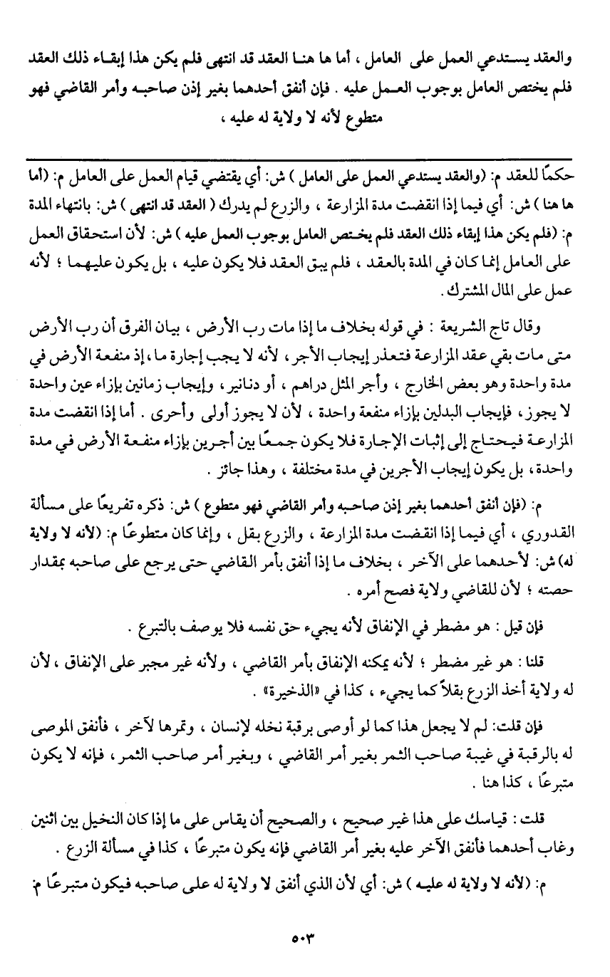 والعقد يستدعي العمل على العامل، أما هاهنا العقد قد انتهى فلم يكن هذا إبقاء ذلك العقد فلم يختص العامل بوجوب العمل عليه. فإن أنفق أحدهما بغير إذن صاحبه وأمر القاضي فهو متطوع لأنه لا ولاية له عليه