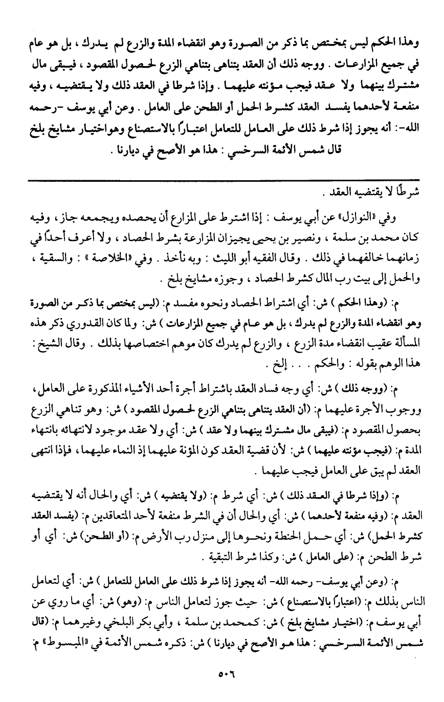 وهذا الحكم ليس بمختص بما ذكر من الصورة وهو انقضاء المدة والزرع لم يدرك، بل هو عام في جميع المزارعات. ووجه ذلك أن العقد يتناهى بتناهي الزرع لحصول المقصود، فيبقى مال مشترك بينهما ولا عقد فيجب مؤنتة عليهما. وإذا شرطا في العقد ذلك ولا يقتضيه، وفيه منفعة لأحدهما يفسد العقد كشرط الحمل أو الطحن على العامل. وعن أبي يوسف - رَحِمَهُ اللَّهُ -: أنه يجوز إذا شرط ذلك على العامل للتعامل اعتبارا بالاستصناع وهو اختيار مشايخ بلخ قال شمس الأئمة السرخسي: هذا هو الأصح في ديارنا.