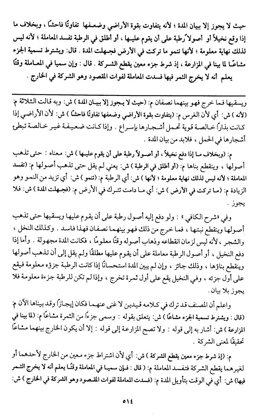 وفي " شرح الكافي ": ولو دفع إليه أصول رطبة على أن يقوم عليها ويسقيها حتى تذهب أصولها وينقطع نبتها، فما خرج من ذلك فهو بينهما نصفان فهذا فاسد. وكذلك النخل، والشجر، لأنه ليس لزمان انقطاعه وذهاب أصوله وقتا معلوما، فكانت المدة مجهولة. وأما إذا دفع النخيل، أو أصول الرطبة معاملة على أن يقوم عليها مطلقا ولم يقل إلى أن تذهب أصولها وينقطع بناؤها، وذلك جائز، وإن لم يبين المدة استحسانا إذا كانت الرطبة جزؤه معلومة فيقع على أول جزئه، وفي النخيل يقع على أول ثمرة تخرج، وإذا لم تكن للرطبة جزءة معلومة فلا يجوز بلا بيان.