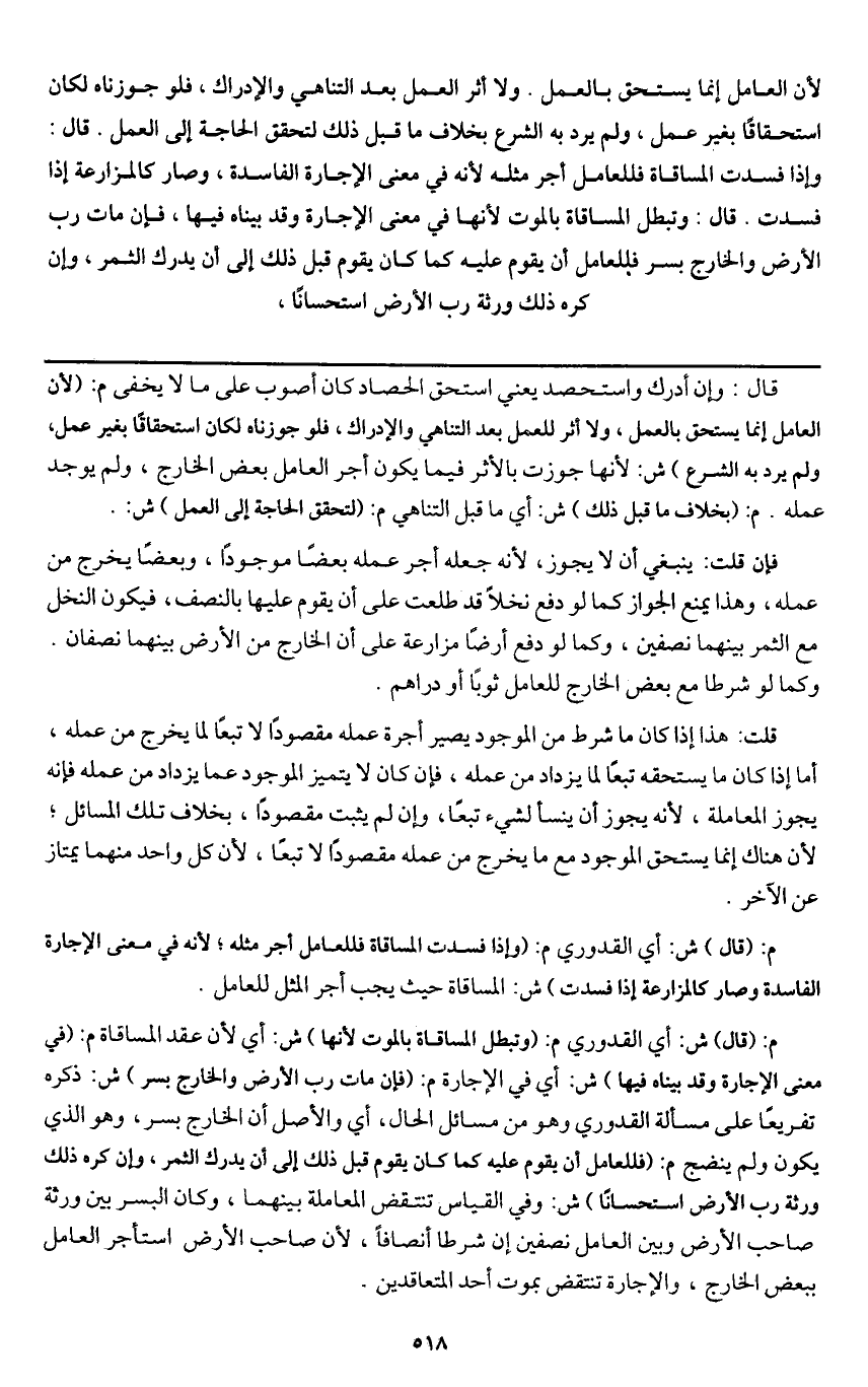 قلت: هذا إذا كان ما شرط من الموجود يصير أجرة عمله مقصودا لا تبعا لما يخرج من عمله، أما إذا كان ما يستحقه تبعا لما يزداد من عمله، فإن كان لا يتميز الموجود عما يزداد من عمله فإنه يجوز المعاملة، لأنه يجوز أن ينسأ لشيء تبعا، وإن لم يثبت مقصودا، بخلاف تلك المسائل؛ لأن هناك إنما يستحق الموجود مع ما يخرج من عمله مقصودا لا تبعا، لأن كل واحد منهما يمتاز عن الآخر.