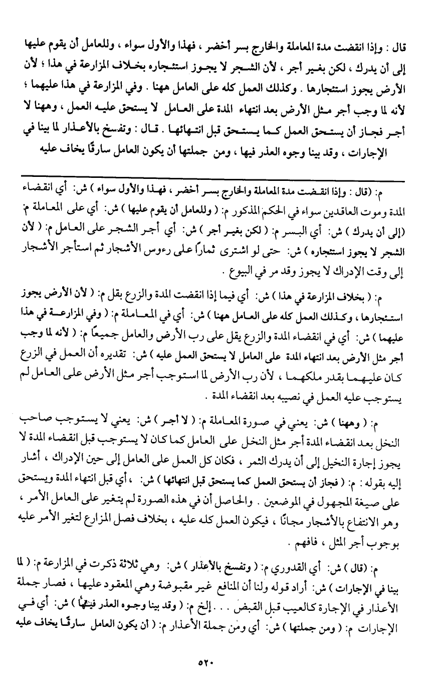 قال: وإذا انقضت مدة المعاملة والخارج بسر أخضر، فهذا والأول سواء، وللعامل أن يقوم عليها إلى أن يدرك، لكن بغير أجر، لأن الشجر لا يجوز استئجاره بخلاف المزارعة في هذا؛ لأن الأرض يجوز استئجارها. وكذلك العمل كله على العامل هاهنا. وفي المزارعة في هذا عليهما؛ لأنه لما وجب أجر مثل الأرض بعد انتهاء المدة على العامل لا يستحق عليه العمل، وهاهنا لا أجر فجاز أن يستحق العمل كما يستحق قبل انتهائها.