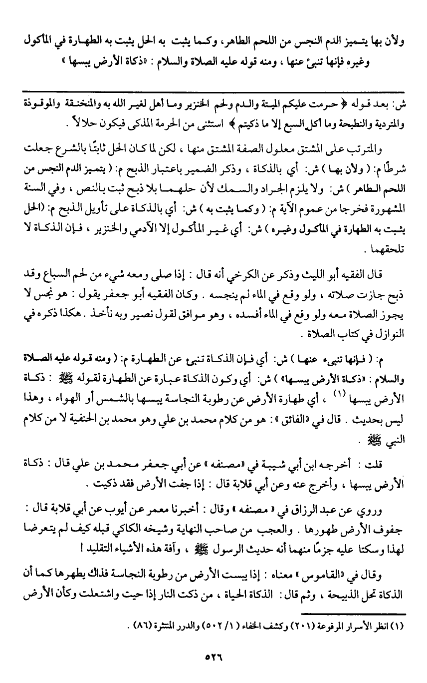 م: (فإنها تنبئ عنها) ش: أي فإن الذكاة تنبئ عن الطهارة م: (ومنه قوله - عَلَيْهِ الصَّلَاةُ وَالسَّلَامُ -: «ذكاة الأرض يبسها» ش: أي وكون الذكاة عبارة عن الطهارة لقوله - صَلَّى اللَّهُ عَلَيْهِ وَسَلَّمَ -: «ذكاة الأرض يبسها» أي طهارة الأرض عن رطوبة النجاسة يبسها بالشمس أو الهواء، وهذا ليس بحديث. قال في " الفائق ": هو من كلام محمد بن علي وهو محمد بن الحنفية لا من كلام النبي - صَلَّى اللَّهُ عَلَيْهِ وَسَلَّمَ -.