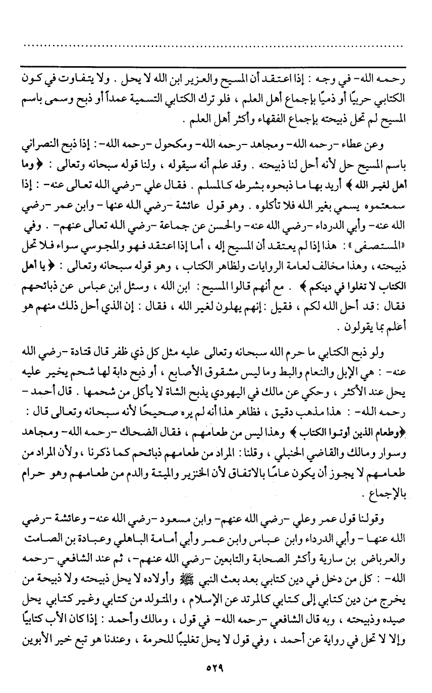 ـــــــــــــــــــــــــــــQ- رَحِمَهُ اللَّهُ - في وجه: إذا اعتقد أن المسيح والعزير ابن الله لا يحل. ولا يتفاوت في كون الكتابي حربيا أو ذميا بإجماع أهل العلم، فلو ترك الكتابي التسمية عمدا أو ذبح وسمى باسم المسيح لم تحل ذبيحته بإجماع الفقهاء وأكثر أهل العلم.