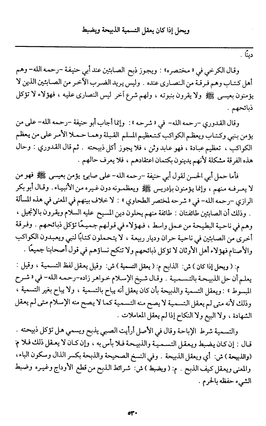 وقال الكرخي في " مختصره ": ويجوز ذبح الصابئين عند أبي حنيفة - رَحِمَهُ اللَّهُ - وهم أهل الكتاب وهم فرقة من النصارى عنده. وليس يريد الضرب الآخر من الصابئين الذين لا يؤمنون بعيسى - صَلَّى اللَّهُ عَلَيْهِ وَسَلَّمَ - ولا يقرون بنبوته، ولهم شرع آخر ليس النصارى عليه، فهؤلاء لا تؤكل ذبائحهم.