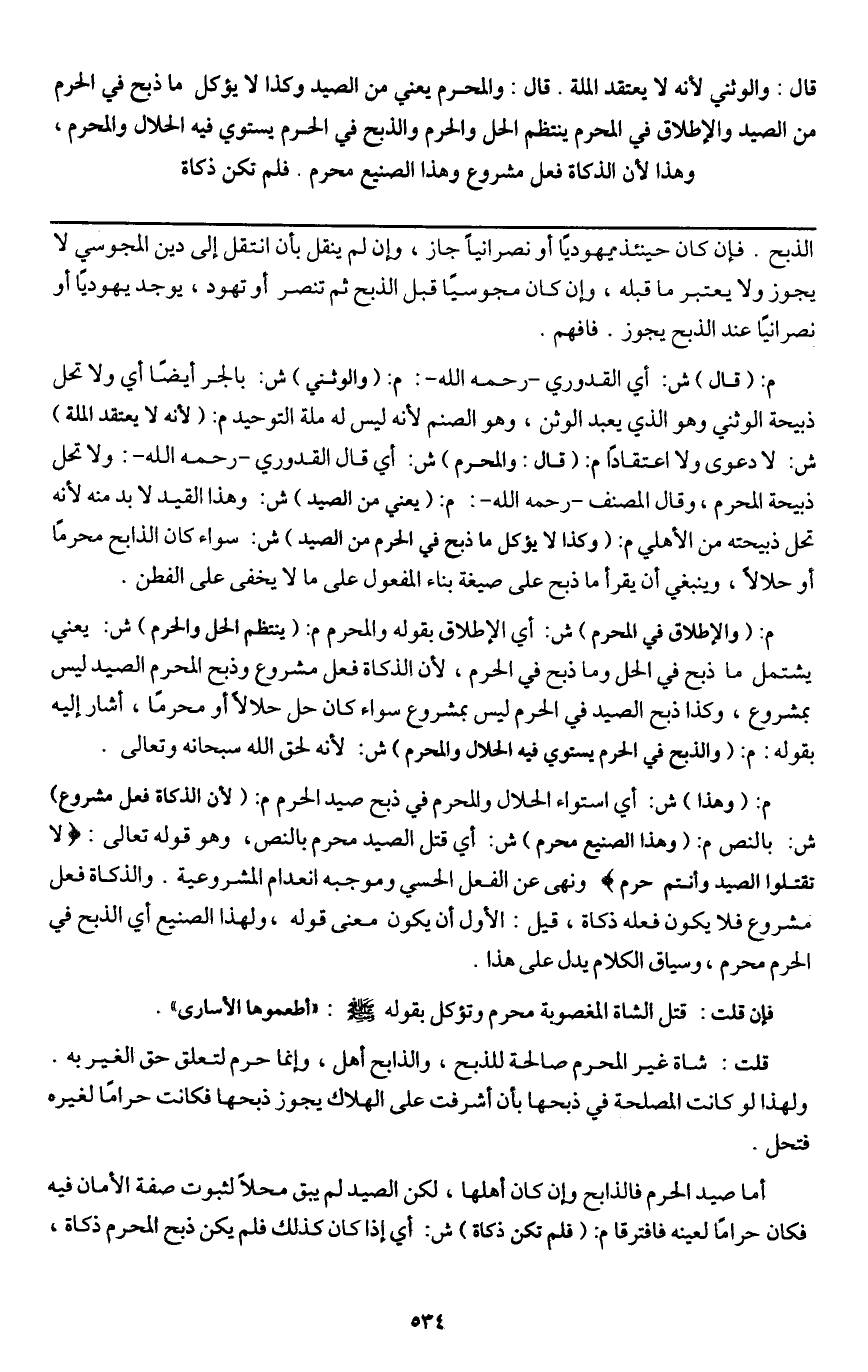 م: (قال) ش: أي القدوري - رَحِمَهُ اللَّهُ - م: (والوثني) ش: بالجر أيضا أي ولا تحل ذبيحة الوثني وهو الذي يعبد الوثن، وهو الصنم لأنه ليس له ملة التوحيد م: (لأنه لا يعتقد الملة) ش: لا دعوى ولا اعتقادا م: (قال: والمحرم) ش: أي قال القدوري - رَحِمَهُ اللَّهُ -: ولا تحل ذبيحة المحرم، وقال المصنف - رَحِمَهُ اللَّهُ -: م: (يعني من الصيد) ش: وهذا القيد لا بد منه لأنه تحل ذبيحته من الأهلي م: (وكذا لا يؤكل ما ذبح في الحرم من الصيد) ش: سواء كان الذابح محرما أو حلالا، وينبغي أن يقرأ ما ذبح على صيغة بناء المفعول على ما لا يخفى على الفطن.