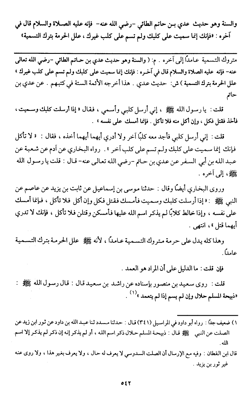 قلت: إني أرسل كلبي فأجد معه كلبا آخر ولا أدري أيهما أخذه، فقال: " لا تأكل فإنك إنما سميت على كلبك ولم تسم على كلب آخر» . رواه البخاري عن آدم عن شعبة عن عبد الله بن أبي السفر عن عدي بن حاتم - رَضِيَ اللَّهُ تَعَالَى عَنْهُ - قال: قلت يا رسول الله - صَلَّى اللَّهُ عَلَيْهِ وَسَلَّمَ -، إلى آخره.