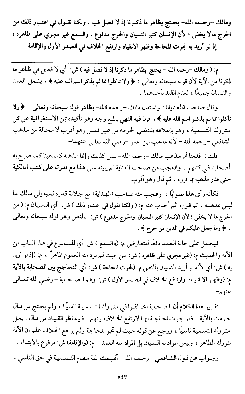 فكأنه رأى هذا صوابا، وعجب منه صاحب " الهداية " مع جلالة قدره نسبه إلى مالك ما ليس بمذهبه. ثم قرره ثم أجاب عنه م: (ولكنا نقول في اعتبار ذلك) ش: أي النسيان م: (من الحرج ما لا يخفى؛ لأن الإنسان كثير النسيان والحرج مدفوع) ش: بالنص وهو قوله سبحانه وتعالى: {وَمَا جَعَلَ عَلَيْكُمْ فِي الدِّينِ مِنْ حَرَجٍ} [الحج: 78] .