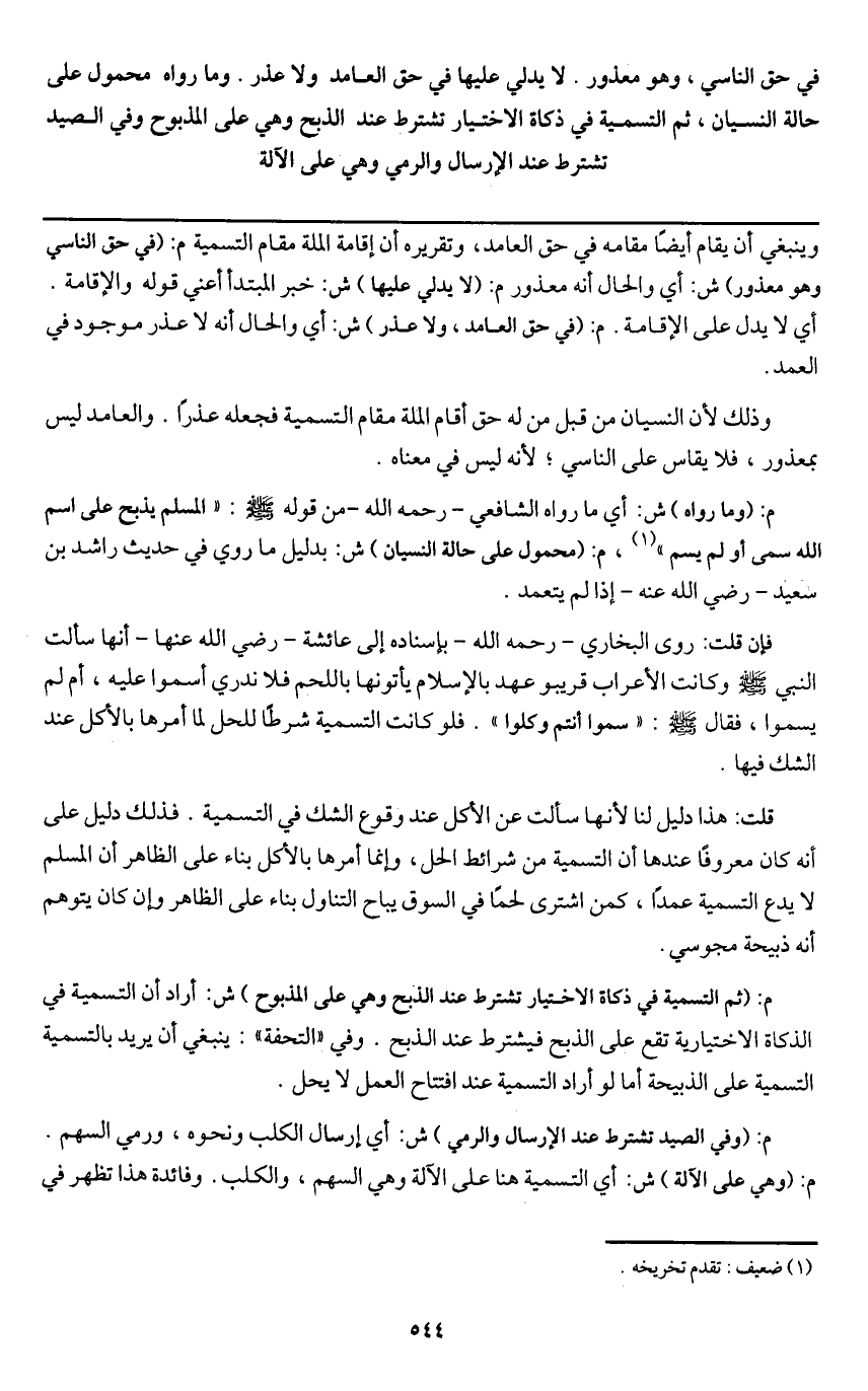 م: (وما رواه) ش: أي ما رواه الشافعي - رَحِمَهُ اللَّهُ - من قوله - صَلَّى اللَّهُ عَلَيْهِ وَسَلَّمَ -: «المسلم يذبح على اسم الله سمى أو لم يسم» ، م: (محمول على حالة النسيان) ش: بدليل ما روي في حديث راشد بن سعيد - رَضِيَ اللَّهُ عَنْهُ - إذا لم يتعمد.