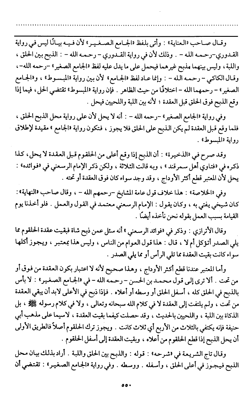 وأما المعتبر عندنا قطع أكثر الأوداج، وهذا صحيح لأنه لا اعتبار بكون العقدة من فوق أو من تحت. ألا ترى إلى قول محمد بن الحسن - رَحِمَهُ اللَّهُ - في " الجامع الصغير ": لا بأس بالذبح في الحلق كله، أسفل الحلق أو وسطه أو أعلاه. فإذا ذبح في الأعلى لا بد أن يبقي العقدة من تحت، ولم يلتفت إلى العقدة لا في كلام الله سبحانه وتعالى، ولا في كلام رسوله - صَلَّى اللَّهُ عَلَيْهِ وَسَلَّمَ -، بل الذكاة بين اللبة، واللحيين بالحديث، وقد حصلت كيفما بقيت العقدة، لا سيما على مذهب أبي حنيفة فإنه يكتفي بالثلاث من الأربع أي ثلاث كانت. ويجوز ترك الحلقوم أصلا فالطريق الأولى أن يحل الذبح إذا قطع الحلقوم من أعلاه، وبقيت العقدة إلى أسفل الحلقوم.
