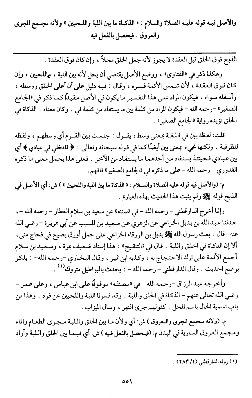 وإنما أخرج الدارقطني - رَحِمَهُ اللَّهُ - في " سننه " عن سعيد بن سلام العطار - رَحِمَهُ اللَّهُ -، حدثنا عبد الله بن بديل الخزاعي عن الزهري عن سعيد بن المسيب عن أبي هريرة - رَضِيَ اللَّهُ عَنْهُ - قال: «بعث رسول الله - صَلَّى اللَّهُ عَلَيْهِ وَسَلَّمَ - بديل بن الورقاء الخزاعي على جمل أورق يصيح في فجاج منى، ألا إن الذكاة في الحلق واللبة.» قال في " التنقيح ": هذا إسناد ضعيف بمرة، وسعيد بن سلام أجمع الأئمة على ترك الاحتجاج به، وكذبه ابن نمير، وقال البخاري - رَحِمَهُ اللَّهُ - يذكر بوضع الحديث. وقال الدارقطني - رَحِمَهُ اللَّهُ -: يحدث بالبواطيل متروك.