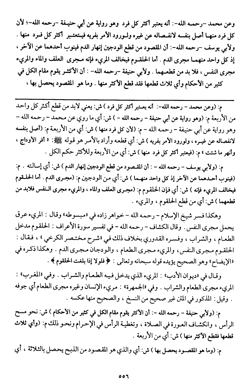 ـــــــــــــــــــــــــــــQم: (وعن محمد - رَحِمَهُ اللَّهُ -: أنه يعتبر أكثر كل فرد) ش: يعني لا بد من قطع أكثر كل واحد من الأربعة م: (وهو رواية عن أبي حنيفة - رَحِمَهُ اللَّهُ -) ش: أي ما روي عن محمد - رَحِمَهُ اللَّهُ - وهو رواية عن أبي حنيفة - رَحِمَهُ اللَّهُ - م: (لأن كل فرد منها) ش: أي من الأربعة م: (أصل بنفسه لانفصاله عن غيره، ولورود الأمر بفريه) ش: أي قطعه وأراد بالأمر هو قوله - صَلَّى اللَّهُ عَلَيْهِ وَسَلَّمَ -: «أفر الأوداج، وأنهر ما شئت» م: (فيعتبر أكثر كل فرد منها) ش: أي من الأربعة وللأكثر حكم الكل.