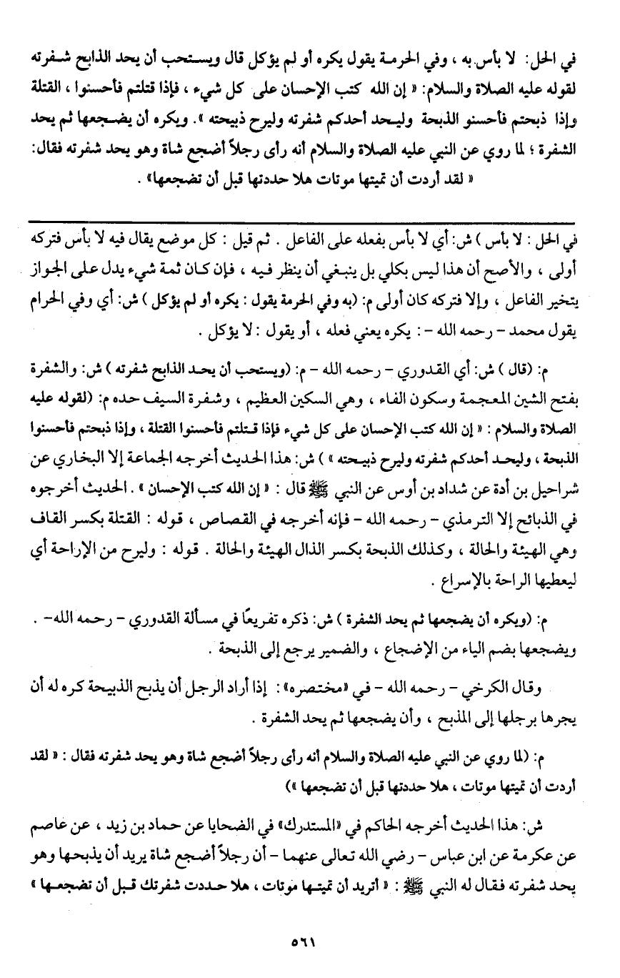 قال: ويستحب أن يحد الذابح شفرته لقوله - عَلَيْهِ الصَّلَاةُ وَالسَّلَامُ -: «إن الله كتب الإحسان على كل شيء، فإذا قتلتم فأحسنوا القتلة، وإذا ذبحتم فأحسنوا الذبحة وليحد أحدكم شفرته وليرح ذبيحته»