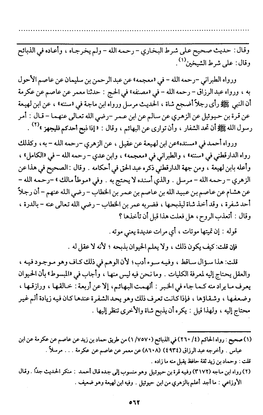 ورواه أحمد في " مسنده " عن ابن لهيعة عن عقيل، عن الزهري - رَحِمَهُ اللَّهُ - به، وكذلك رواه الدارقطني في " سننه "، والطبراني في " معجمه " وابن عدي - رَحِمَهُ اللَّهُ - في " الكامل "، وأعله بابن لهيعة، ومن جهة الدارقطني ذكره عبد الحق في أحكامه. وقال: الصحيح في هذا عن الزهري - رَحِمَهُ اللَّهُ - مرسل. والذي أسنده لا يحتج به. وفي " موطأ مالك " - رَحِمَهُ اللَّهُ - عن هشام عن عاصم بن عبيد الله بن عاصم بن عمر بن الخطاب - رَضِيَ اللَّهُ عَنْهُمْ - أن رجلا أحد شفرة، وقد أخذ شاة ليذبحها، فضربه عمر بن الخطاب - رَضِيَ اللَّهُ تَعَالَى عَنْهُ - بالدرة، وقال: أتعذب الروح، هل فعلت هذا قبل أن تأخذها؟