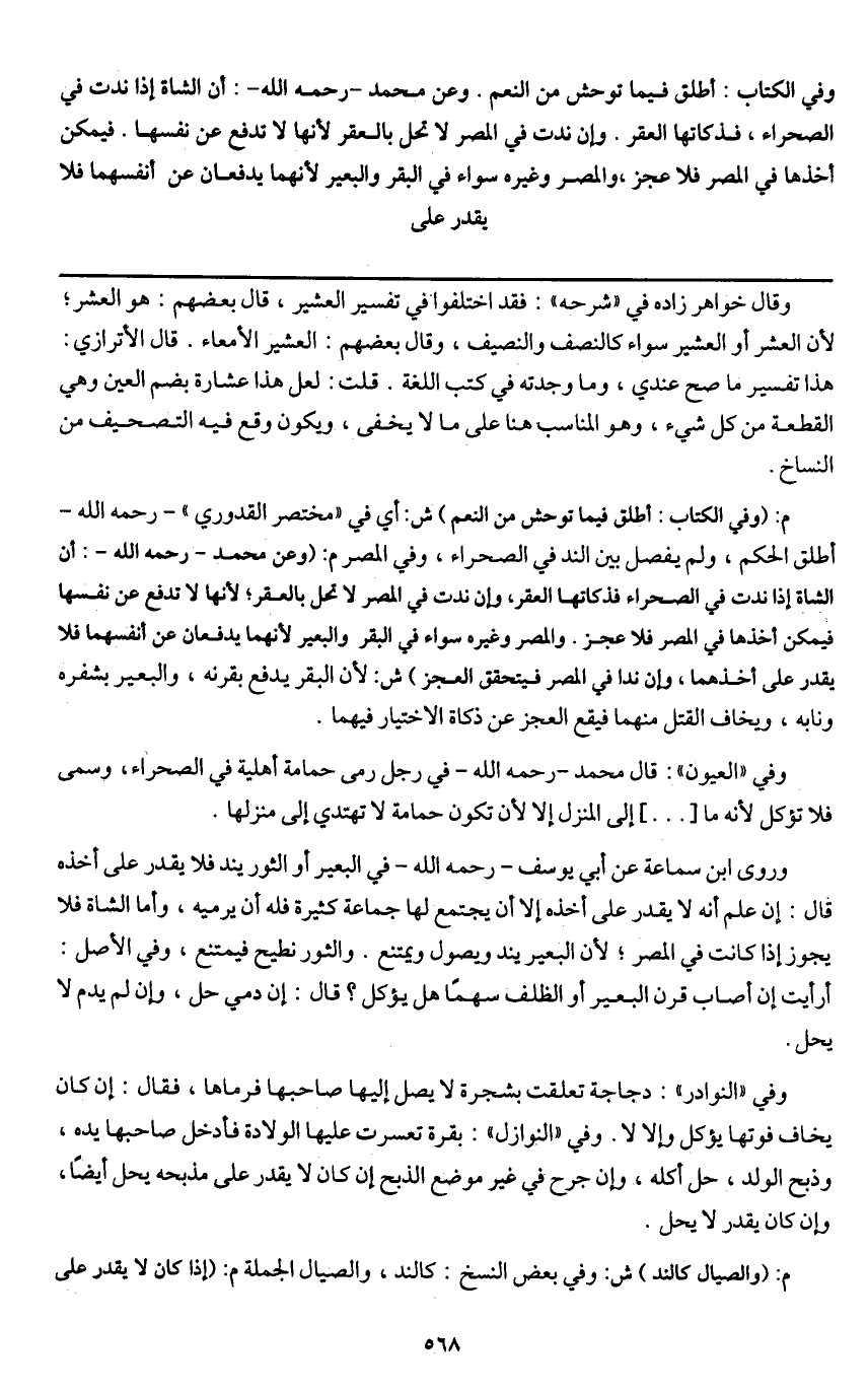م: (وفي الكتاب أطلق فيما توحش من النعم) ش: أي في " مختصر القدوري " - رَحِمَهُ اللَّهُ - أطلق الحكم، ولم يفصل بين الند في الصحراء، وفي المصر. م: (وعن محمد - رَحِمَهُ اللَّهُ -: أن الشاة إذا ندت في الصحراء فذكاتها العقر، وإن ندت في المصر لا تحل بالعقر؛ لأنها لا تدفع عن نفسها فيمكن أخذها في المصر فلا عجز. والمصر وغيره سواء في البقر والبعير لأنهما يدفعان عن أنفسهما فلا يقدر أخذهما، وإن ندا في المصر فيتحقق العجز) ش: لأن البقر يدفع بقرته، والبعير بشفره ونابه، ويخاف القتل منهما فيقع العجز عن ذكاة الاختيار فيهما.