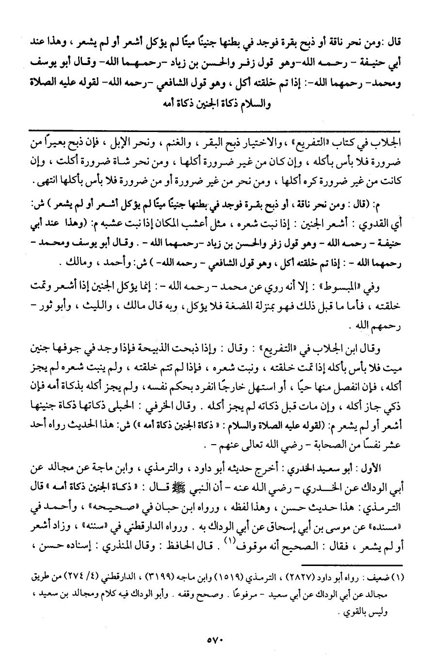قال: ومن نحر ناقة أو ذبح بقرة فوجد في بطنها جنينا ميتا لم يؤكل أشعر أو لم يشعر، وهذا عند أبي حنيفة - رَحِمَهُ اللَّهُ - وهو قول زفر والحسن بن زياد - رحمهما الله - وقال أبو يوسف ومحمد - رحمهما الله -: إذا تم خلقته أكل، وهو قول الشافعي - رَحِمَهُ اللَّهُ - لقوله - عَلَيْهِ الصَّلَاةُ وَالسَّلَامُ - «ذكاة الجنين ذكاة أمه»