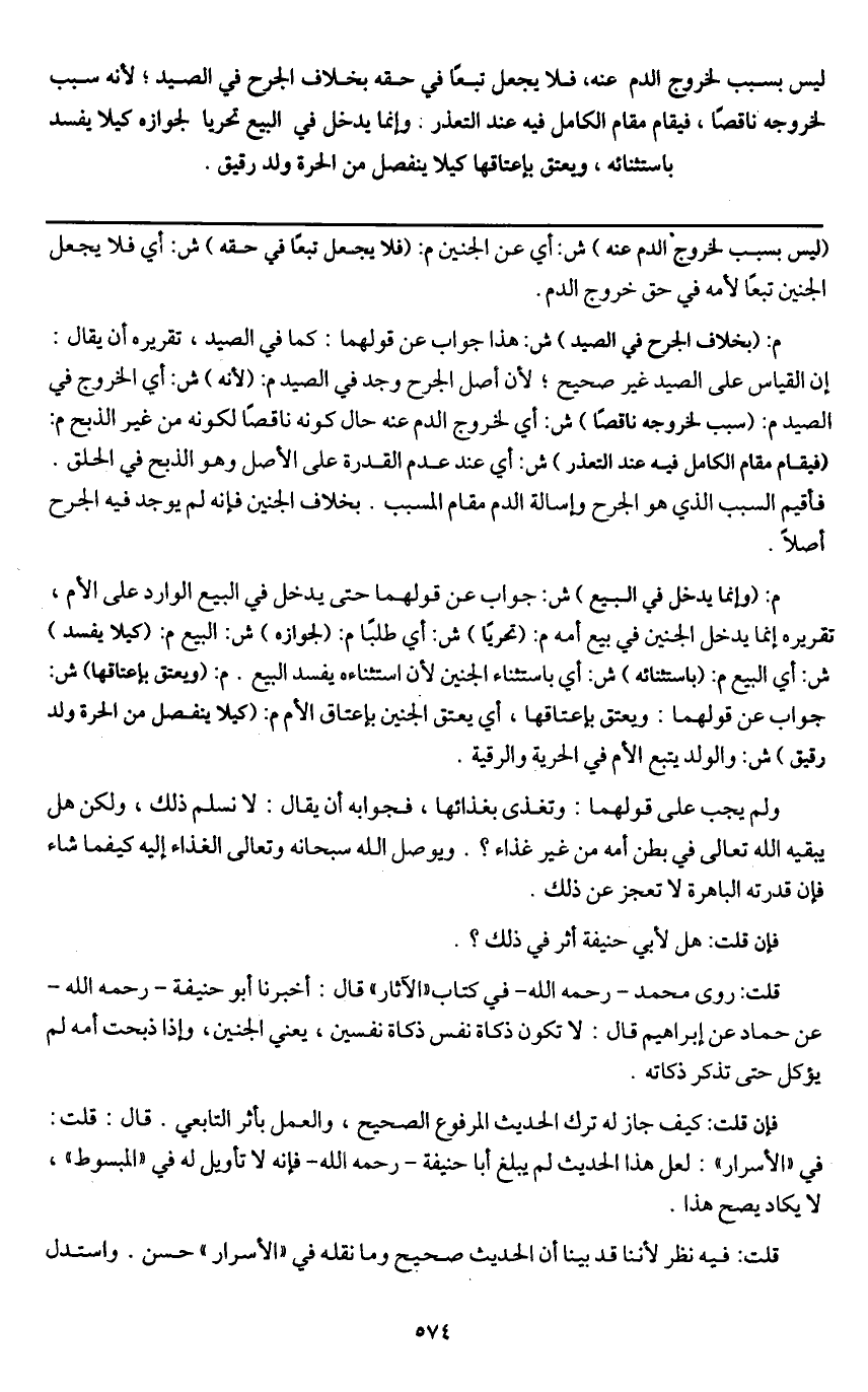 قلت: روى محمد - رَحِمَهُ اللَّهُ - في كتاب " الآثار " قال: أخبرنا أبو حنيفة - رَحِمَهُ اللَّهُ - عن حماد عن إبراهيم قال: لا تكون ذكاة نفس ذكاة نفسين، يعني الجنين، وإذا ذبحت أمه لم يؤكل حتى تذكر ذكاته.