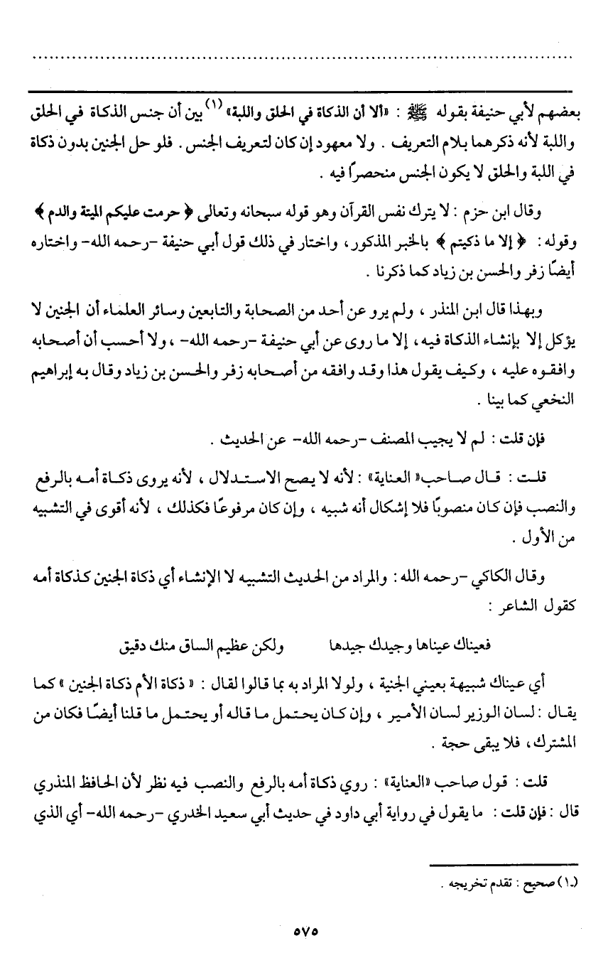 أي عيناك شبيهة بعيني الجنية، ولولا المراد به بما قالوا لقال: " ذكاة الأم ذكاة الجنين " كما يقال: لسان الوزير لسان الأمير، وإن كان يحتمل ما قاله أو يحتمل ما قلنا أيضا فكان من المشترك، فلا يبقى حجة.