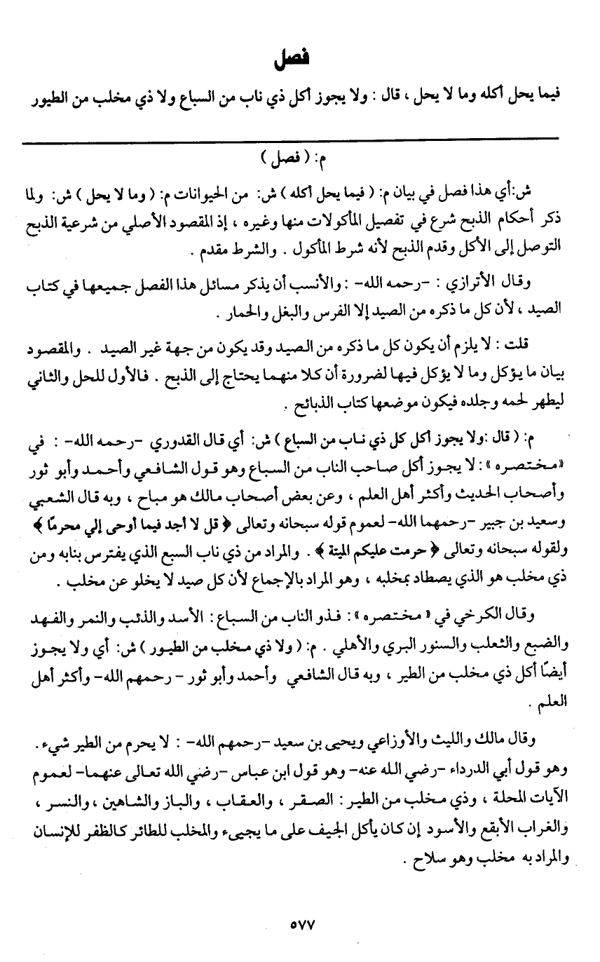 قال: ولا يجوز أكل ذي ناب من السباع ولا ذي مخلب من الطيور