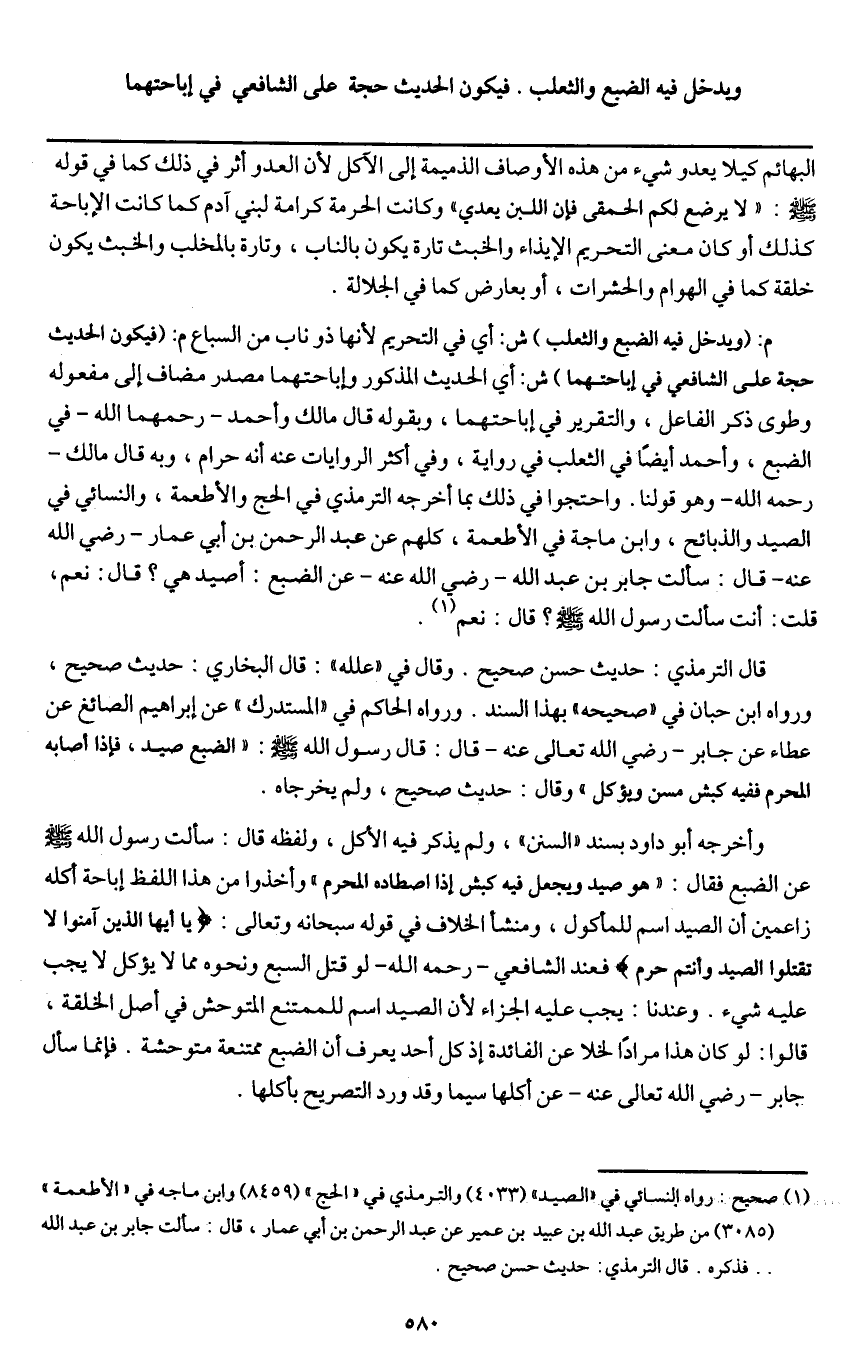 قال الترمذي: حديث حسن صحيح. وقال في " علله ": قال البخاري: حديث صحيح، ورواه ابن حبان في " صحيحه " بهذا السند. ورواه الحاكم في " المستدرك " عن إبراهيم الصائغ عن عطاء عن جابر - رَضِيَ اللَّهُ تَعَالَى عَنْهُ - قال: قال رسول الله - صَلَّى اللَّهُ عَلَيْهِ وَسَلَّمَ -: «الضبع صيد، فإذا أصابه المحرم ففيه كبش مسن ويؤكل» وقال: حديث صحيح، ولم يخرجاه.