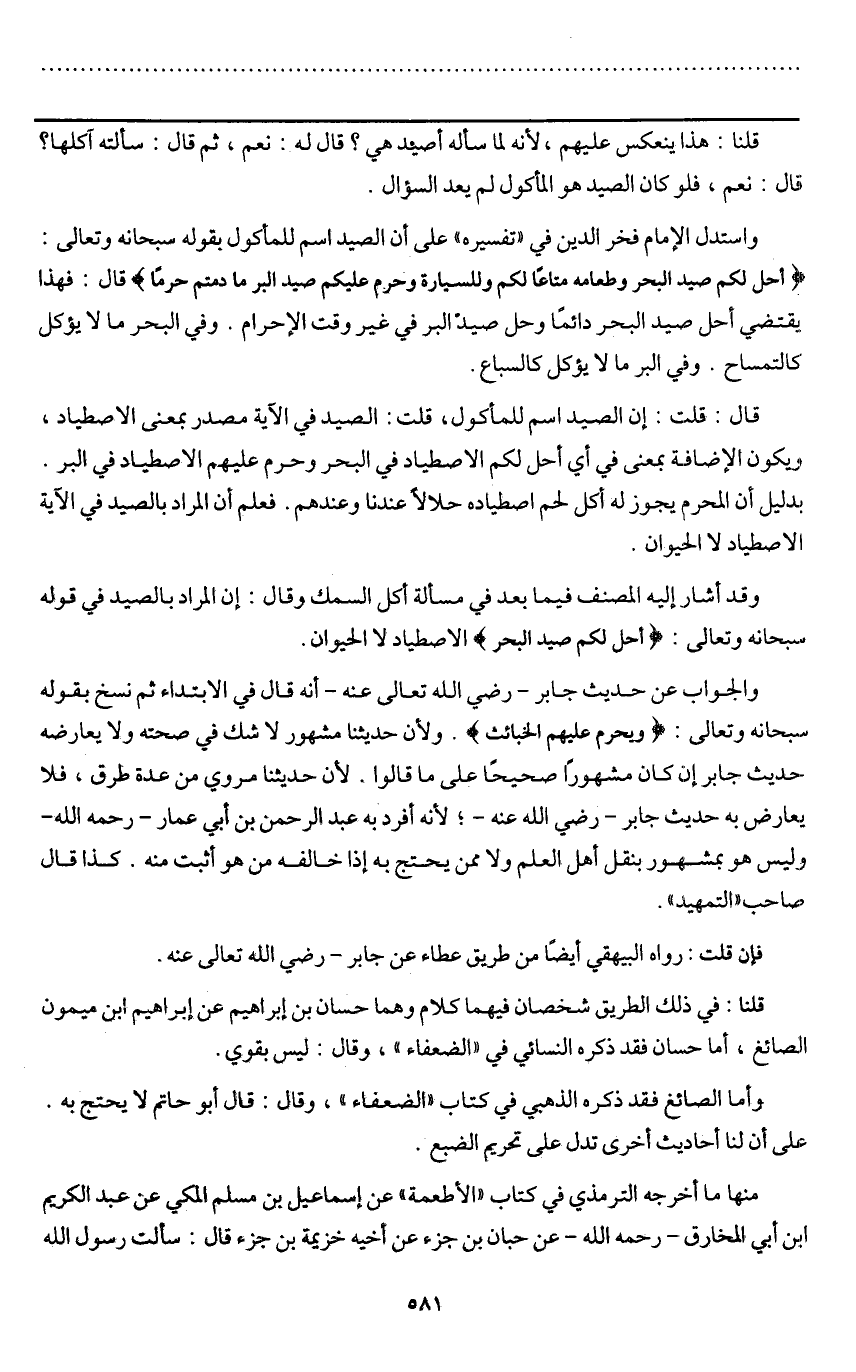 قال: قلت: إن الصيد اسم للمأكول، قلت: الصيد في الآية مصدر بمعنى الاصطياد، ويكون الإضافة بمعنى في أي أحل لكم الاصطياد في البحر وحرم عليهم الاصطياد في البر. بدليل أن المحرم يجوز له أكل لحم اصطياده حلالا عندنا وعندهم. فعلم أن المراد بالصيد في الآية الاصطياد لا الحيوان.