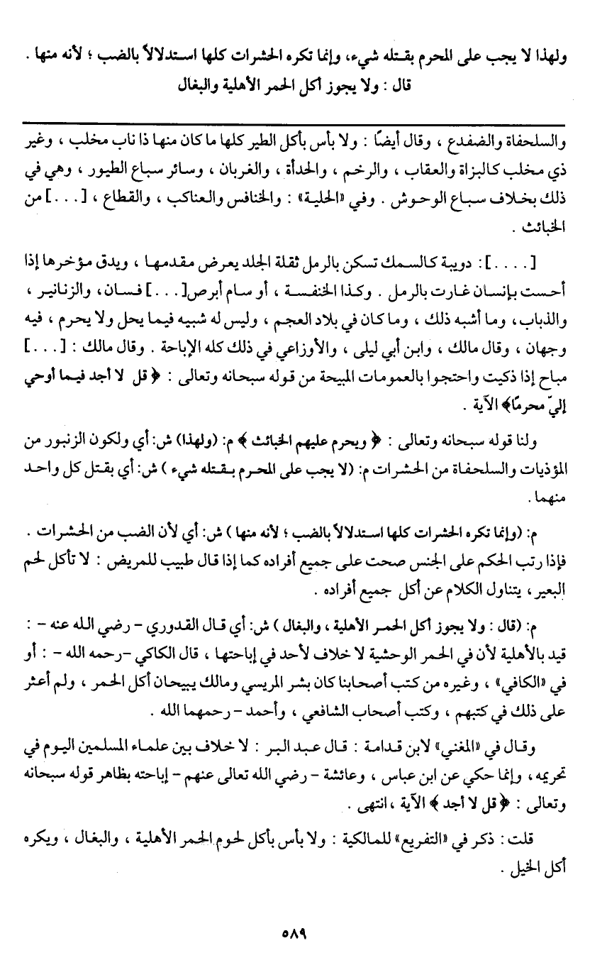 ـــــــــــــــــــــــــــــQوالسلحفاة والضفدع، وقال أيضا: ولا بأس بأكل الطير كلها ما كان منها ذا ناب مخلب، وغير ذي مخلب كالبزاة والعقاب، والرخم، والحدأة، والغربان، وسائر سباع الطيور، وهي في ذلك بخلاف سباع الوحوش. وفي " الحلية ": والخنافس والعناكب، والقطاع، [ ... ] من الخبائث.