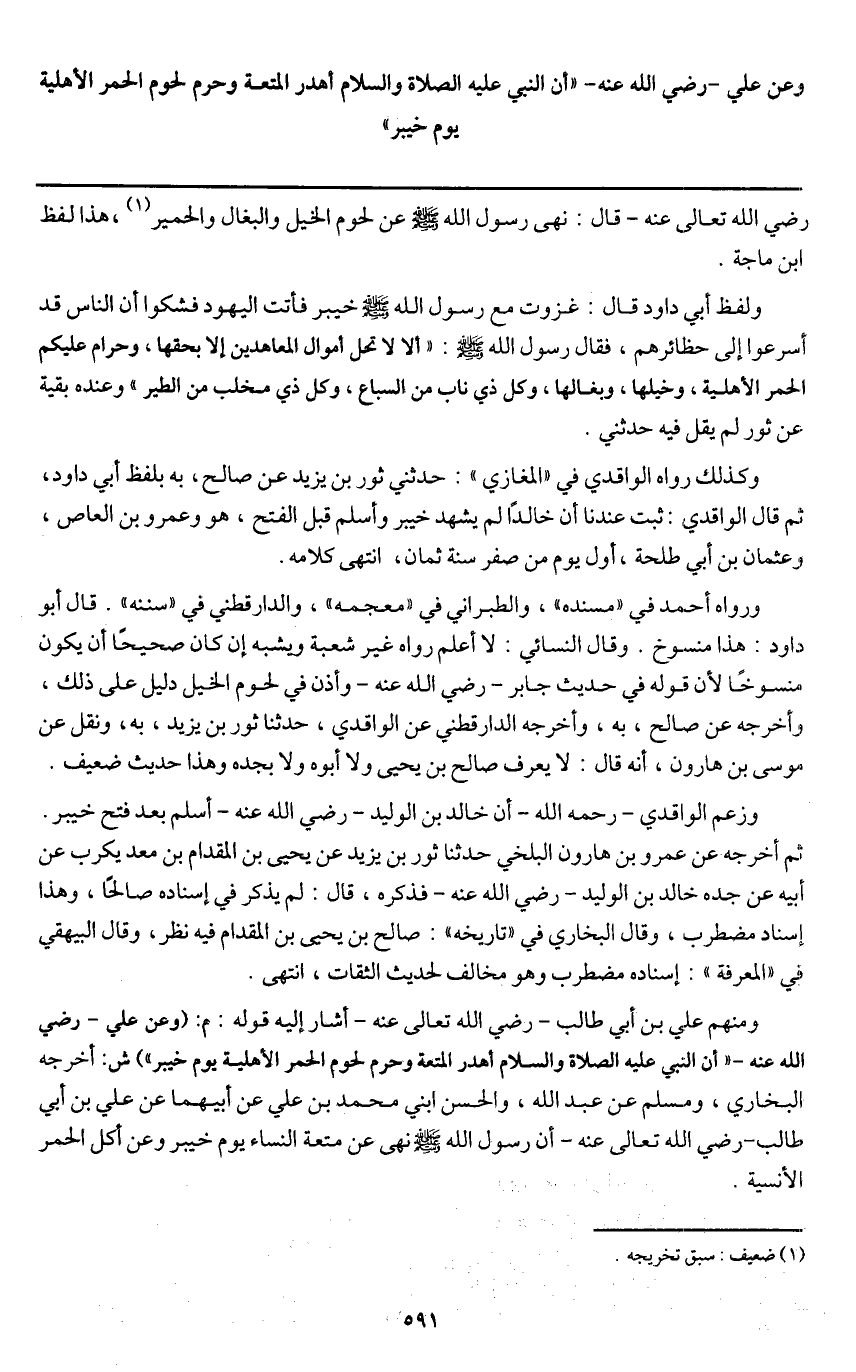 وعن علي - رَضِيَ اللَّهُ عَنْهُ - «أن النبي - عَلَيْهِ الصَّلَاةُ وَالسَّلَامُ - أهدر المتعة وحرم لحوم الحمر الأهلية يوم خيبر»
