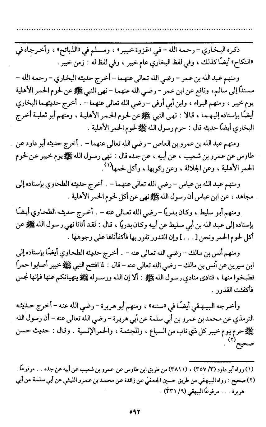 ومنهم عبد الله بن عمر - رَضِيَ اللَّهُ تَعَالَى عَنْهُمَا - أخرج حديثه البخاري - رَحِمَهُ اللَّهُ - مسندا إلى سالم، ونافع عن ابن عمر - رَضِيَ اللَّهُ عَنْهُمَا - «نهى النبي - صَلَّى اللَّهُ عَلَيْهِ وَسَلَّمَ - عن لحوم الحمر الأهلية يوم خيبر،» ومنهم البراء، وابن أبي أوفى - رَضِيَ اللَّهُ تَعَالَى عَنْهُمَا - أخرج حديثهما البخاري أيضا بإسناده إليهما، قالا: «نهى النبي - صَلَّى اللَّهُ عَلَيْهِ وَسَلَّمَ - عن لحوم الحمر الأهلية» ومنهم أبو ثعلبة أخرج البخاري أيضا حديثه قال: «حرم رسول الله - صَلَّى اللَّهُ عَلَيْهِ وَسَلَّمَ - لحوم الحمر الأهلية» .