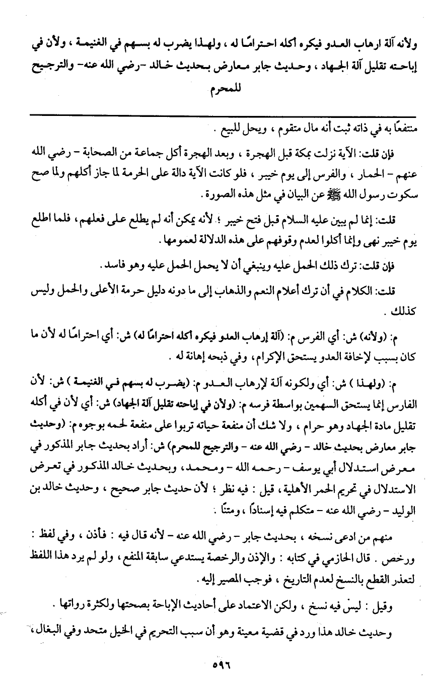 ولأنه آلة إرهاب العدو فيكره أكله احتراما له، ولهذا يضرب له بسهم في الغنيمة، ولأن في إباحته تقليل آلة الجهاد، وحديث جابر معارض بحديث خالد - رَضِيَ اللَّهُ عَنْهُ - والترجيح للمحرم